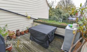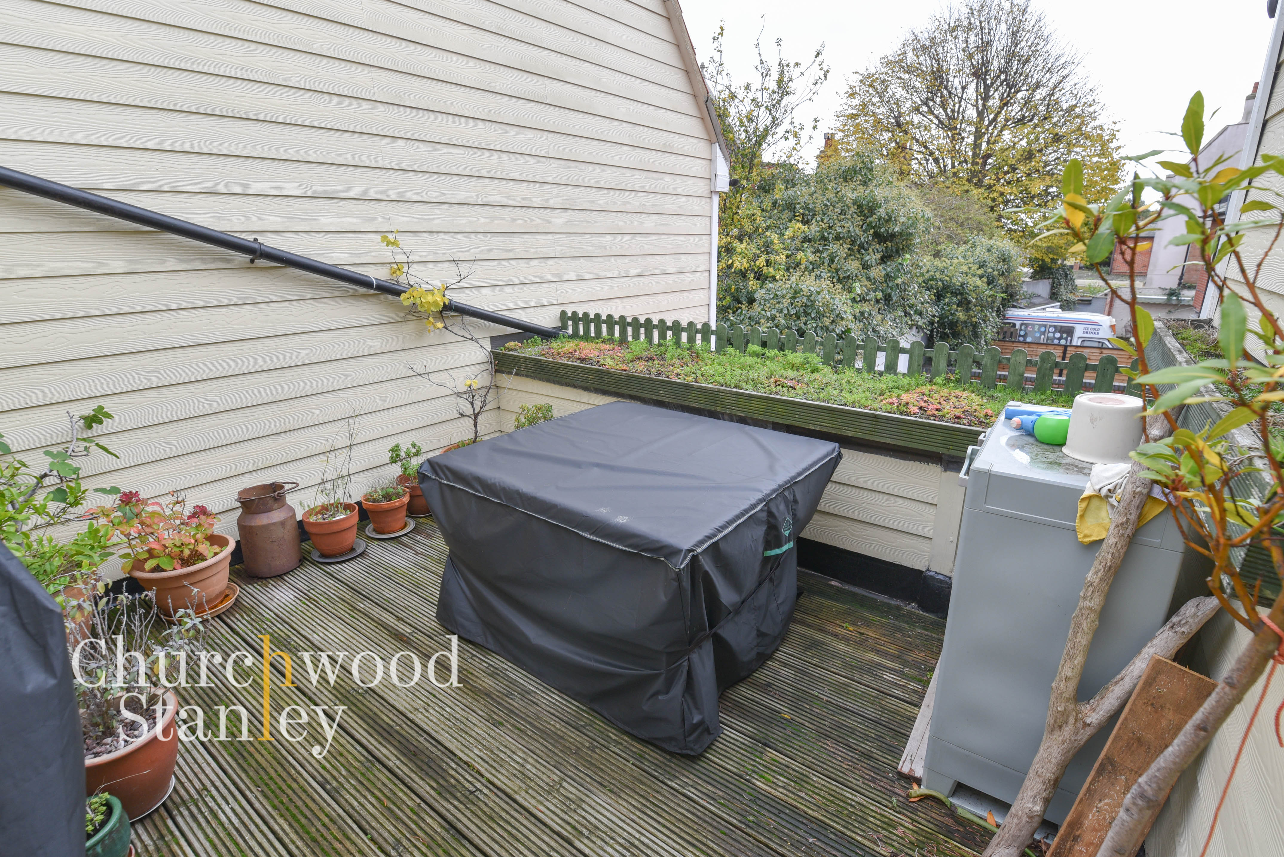 Also on the first floor is a sleek L-shaped bathroom with a mix of vintage charm and modern fittings (including a rainfall shower head and efficient new combi boiler ). Step outside from the landing and you discover the roof terrace, a real asset of this property. Sheltered on three sides and bathed in southerly sunlight, the decked terrace with a full width retractable canopy is a private sanctuary.