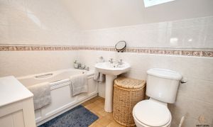 The bathroom has a low level wc, a pedestal hand basin, and a bath. There are half tiled walls and a velux window to the front.