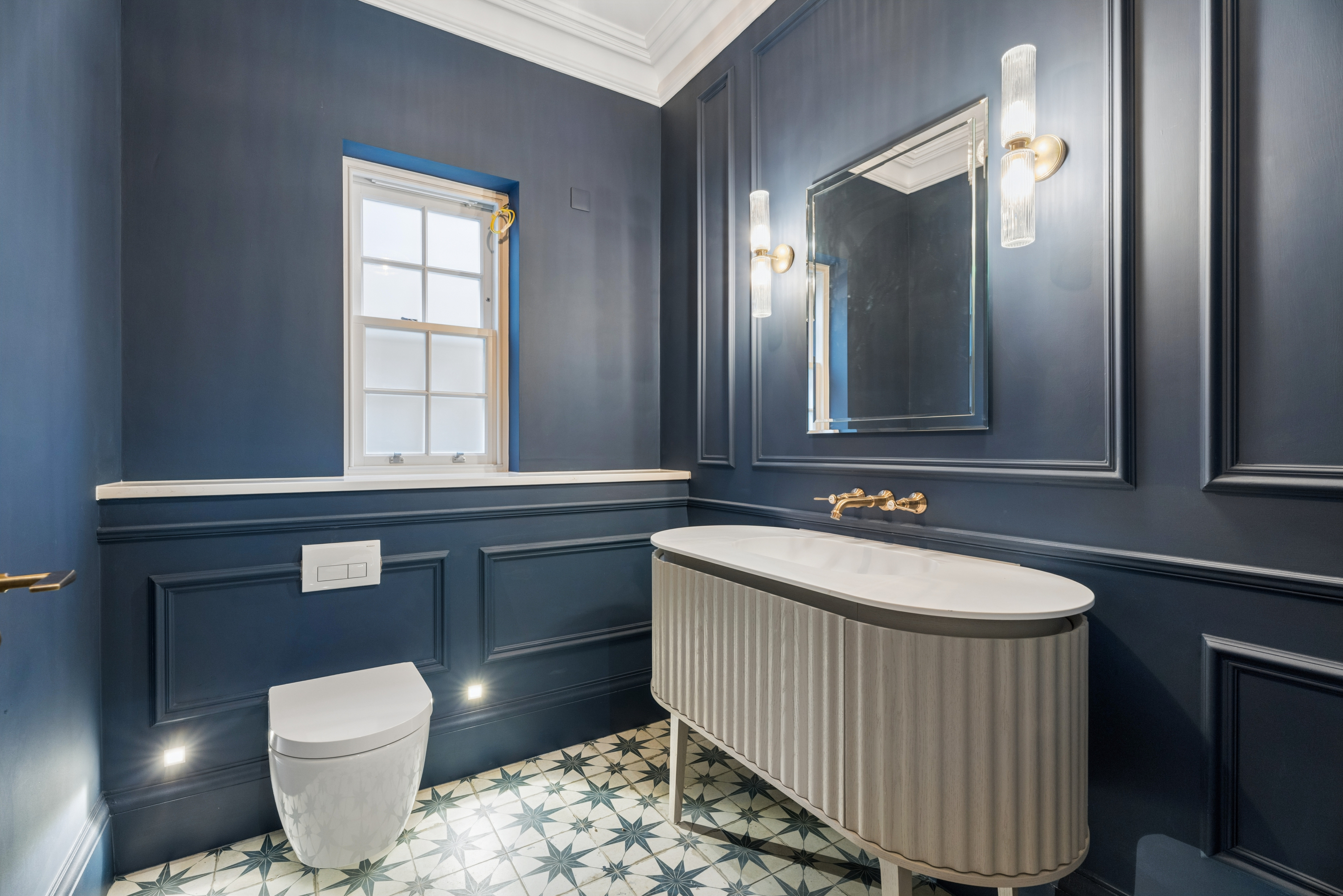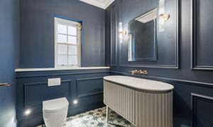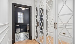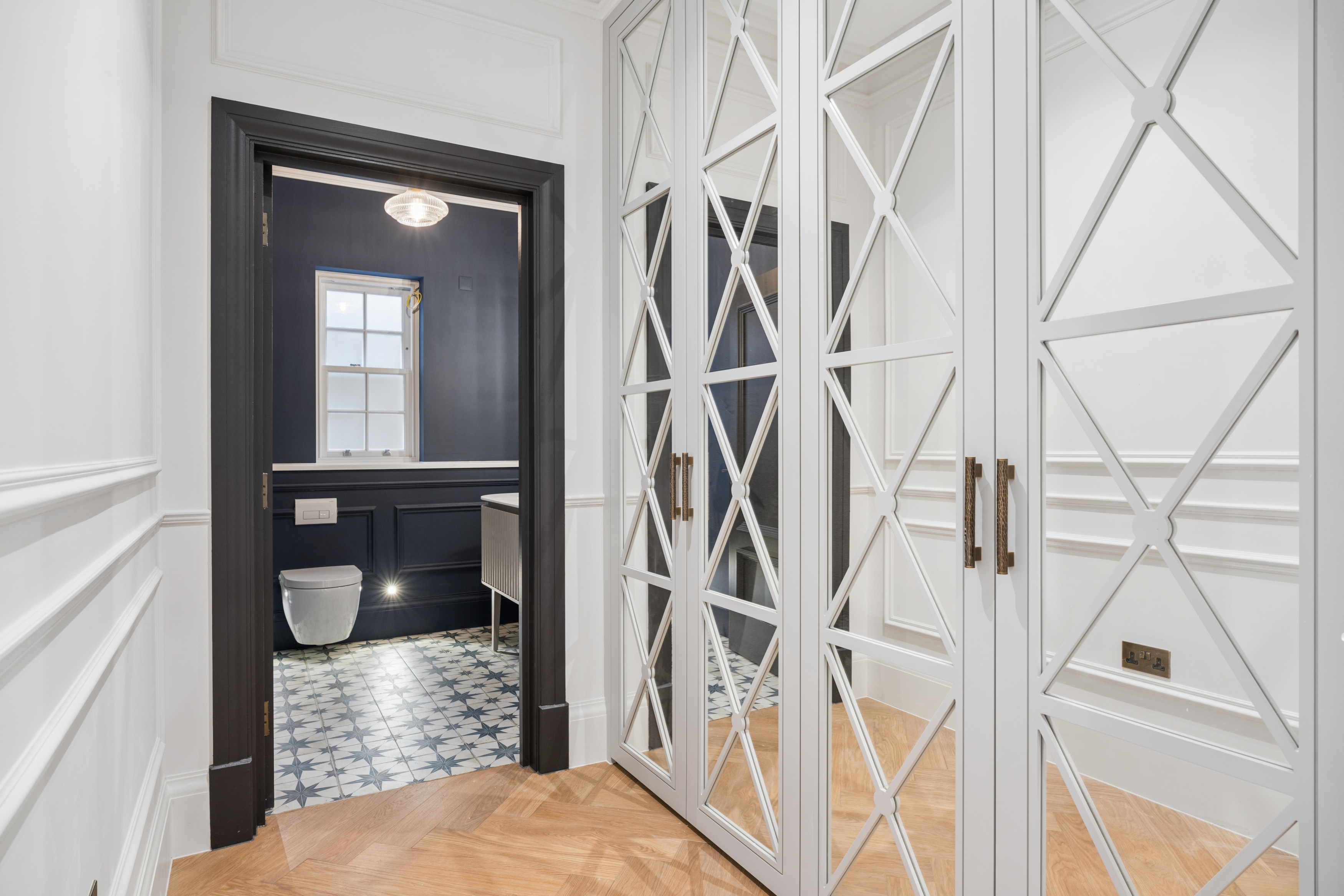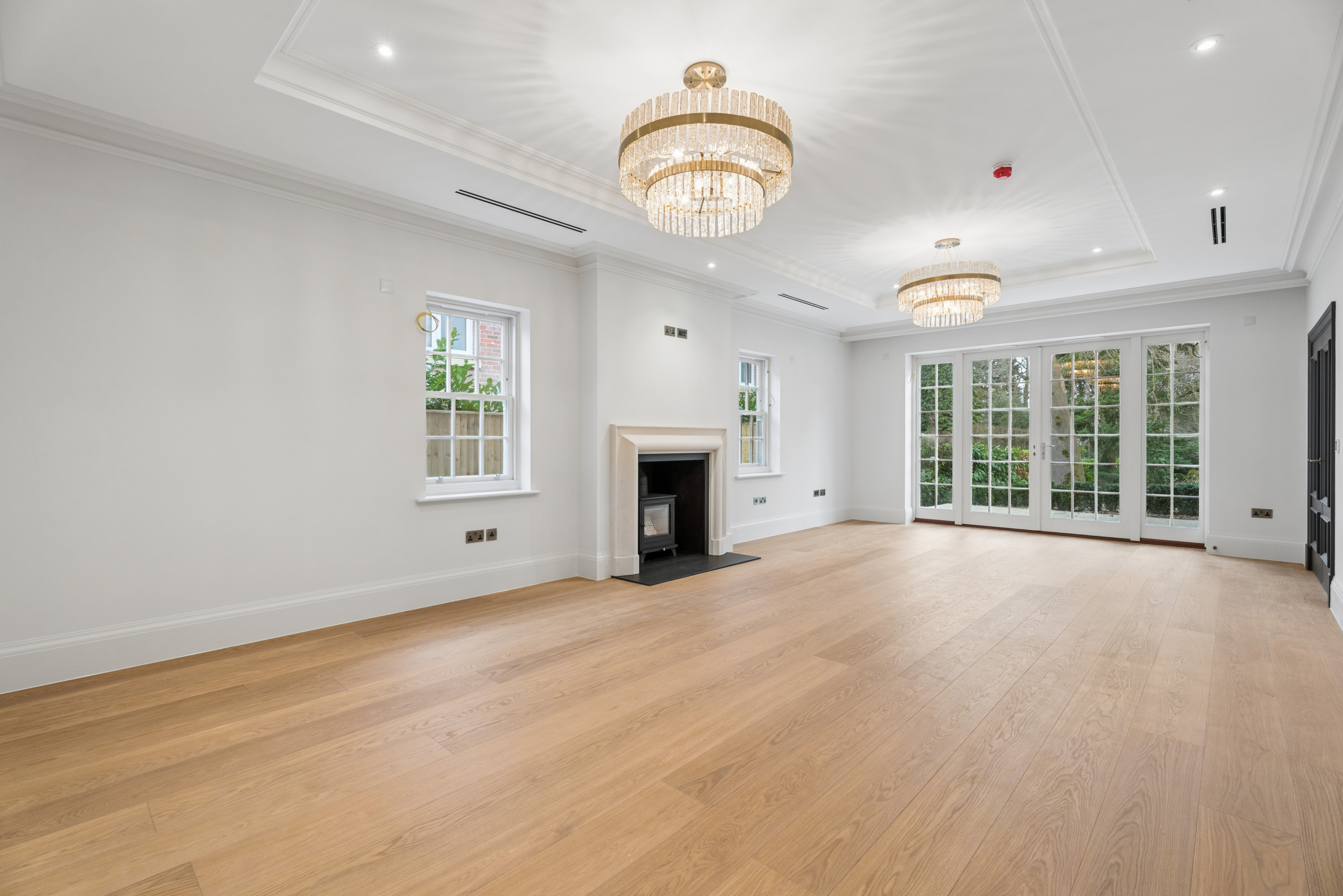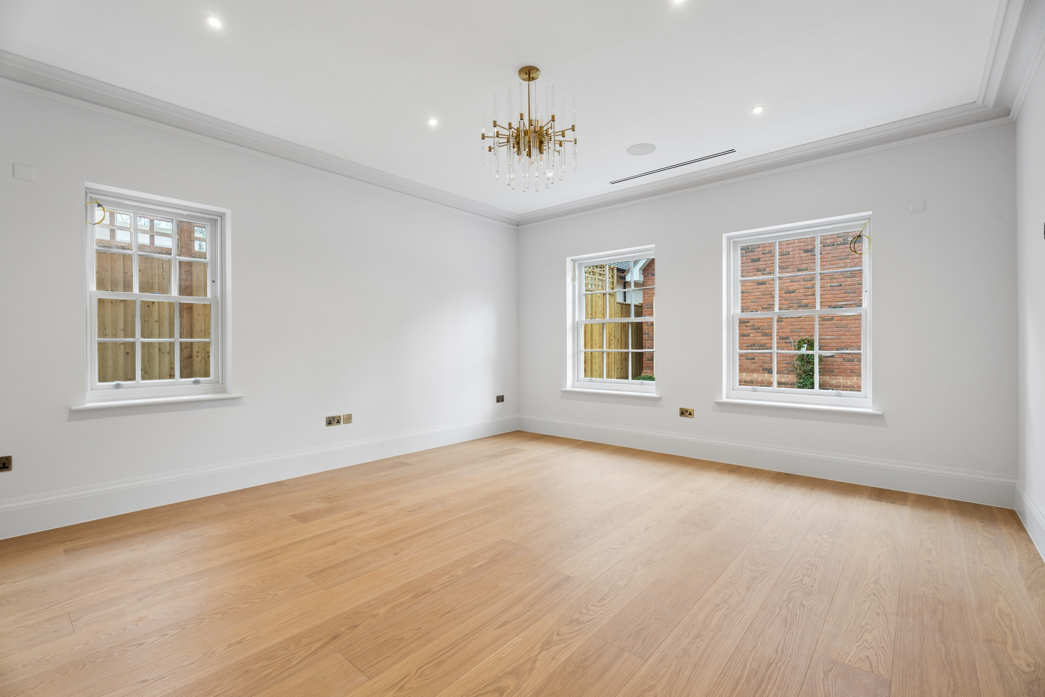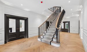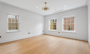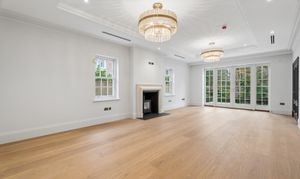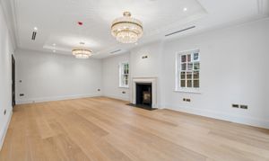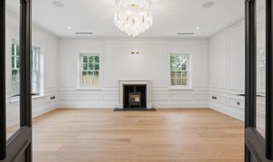 Inside, timeless detailing meets contemporary comfort. Traditional sash windows and bespoke wall panelling complement herringbone engineered oak flooring that flows throughout the principal reception areas. Underfloor heating serves both the ground and first floors, while air conditioning provides additional comfort to the living room, dining room, kitchen, study and principal bedroom.