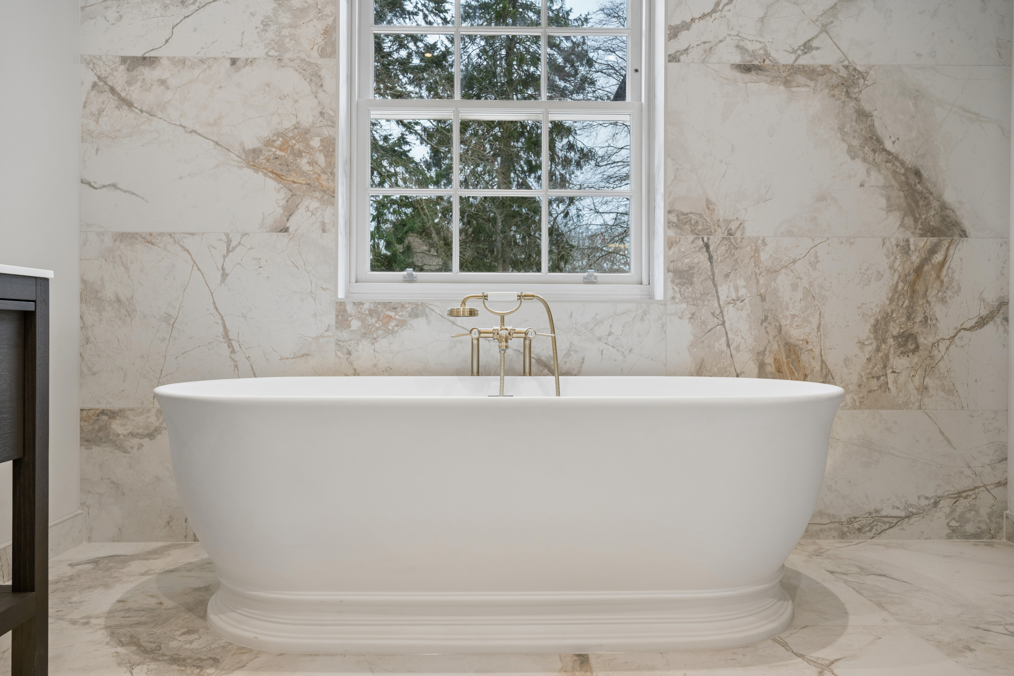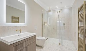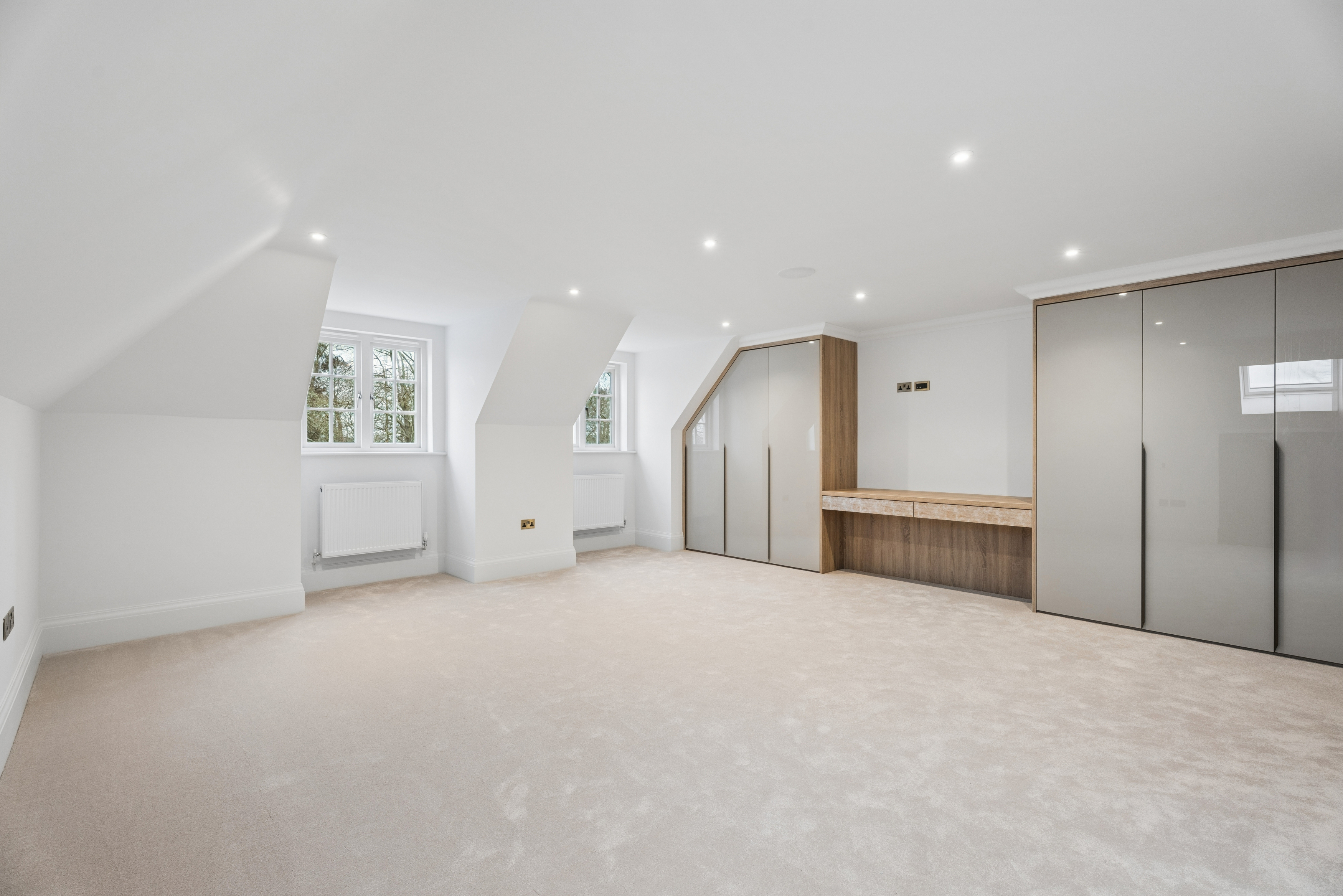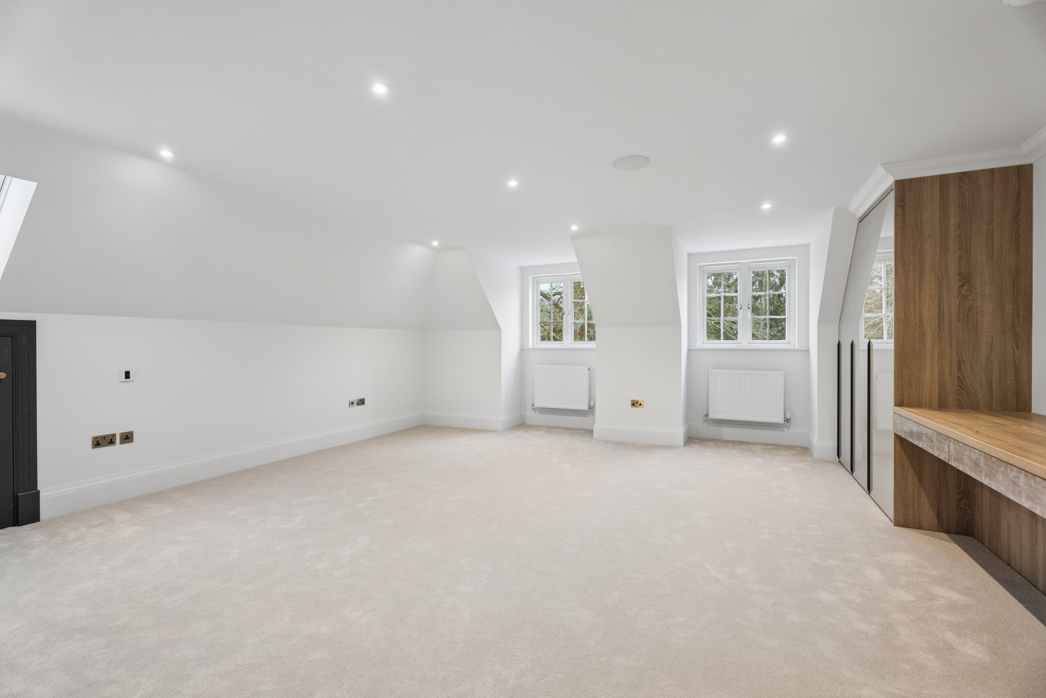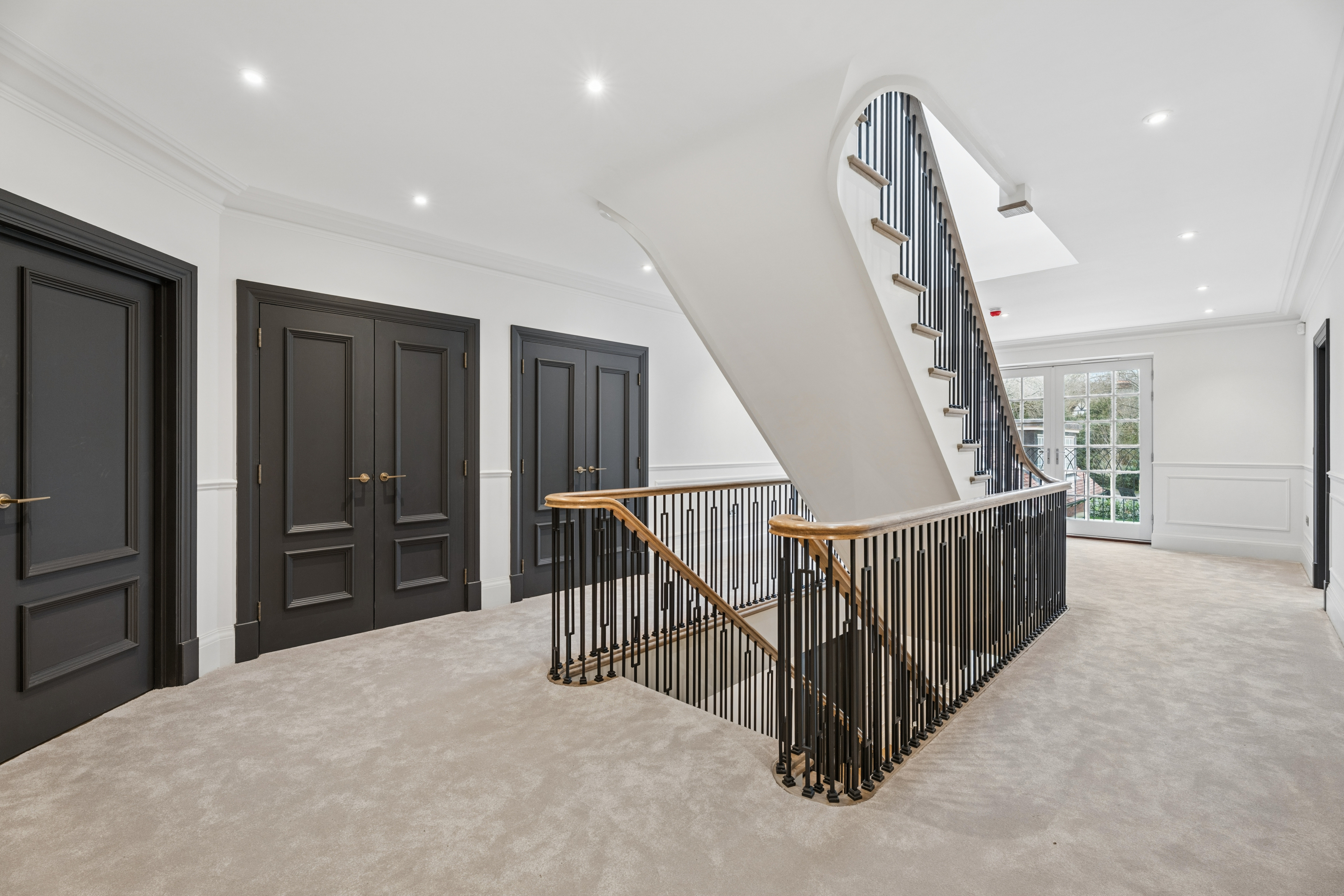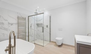 The home offers six generously proportioned bedroom suites, each with its own beautifully finished bathroom. The principal suite is particularly impressive, benefitting from a private balcony and a luxuriously appointed bathroom featuring Lusso stone bath and high-end sanitaryware.