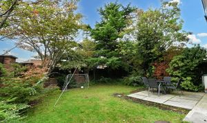 Garden with lawn, paved seating area and side access.