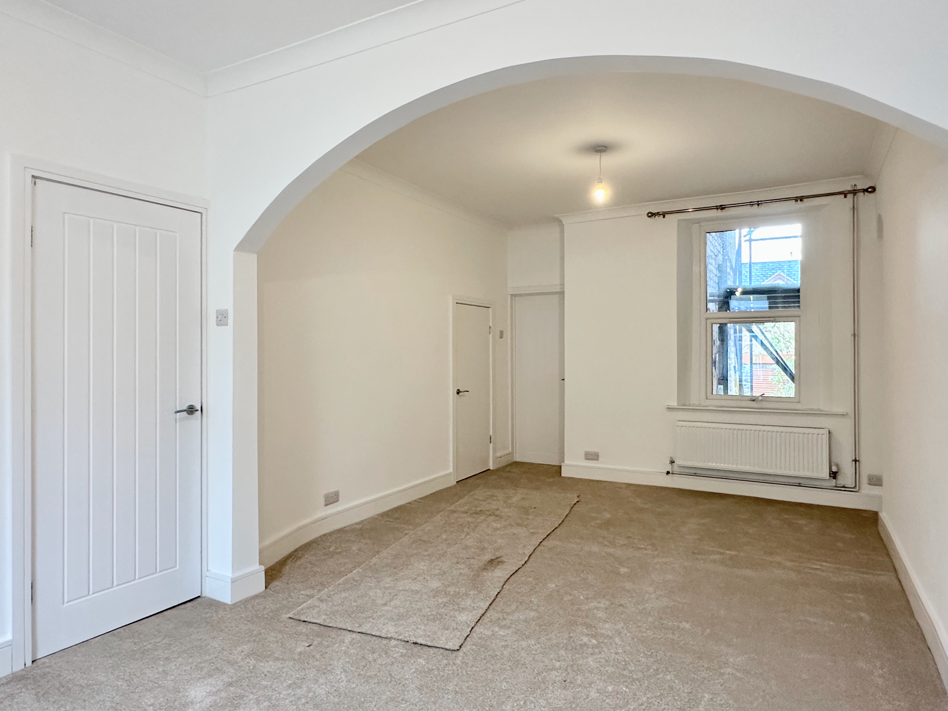 Internally, this unfurnished home has been fully renovated throughout and comprises an open-plan living and dining area leading to a new fitted kitchen with contemporary units and ample storage.