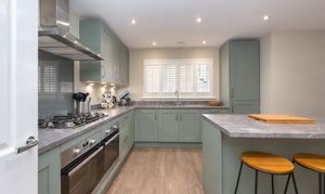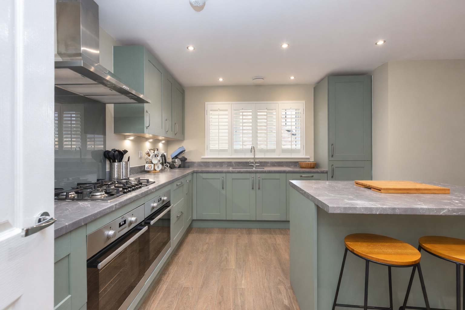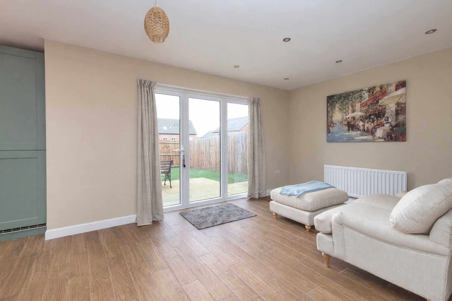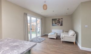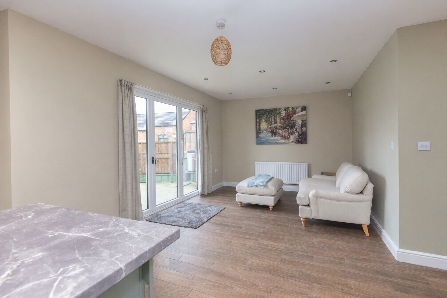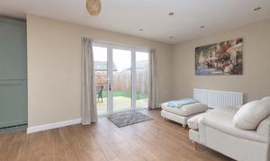 The kitchen area is fitted with contemporary units and integrated appliances, while bi-fold doors seamlessly connect the living space to the rear aspect, flooding the room with natural light and enhancing the sense of space.