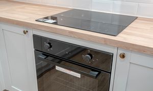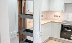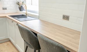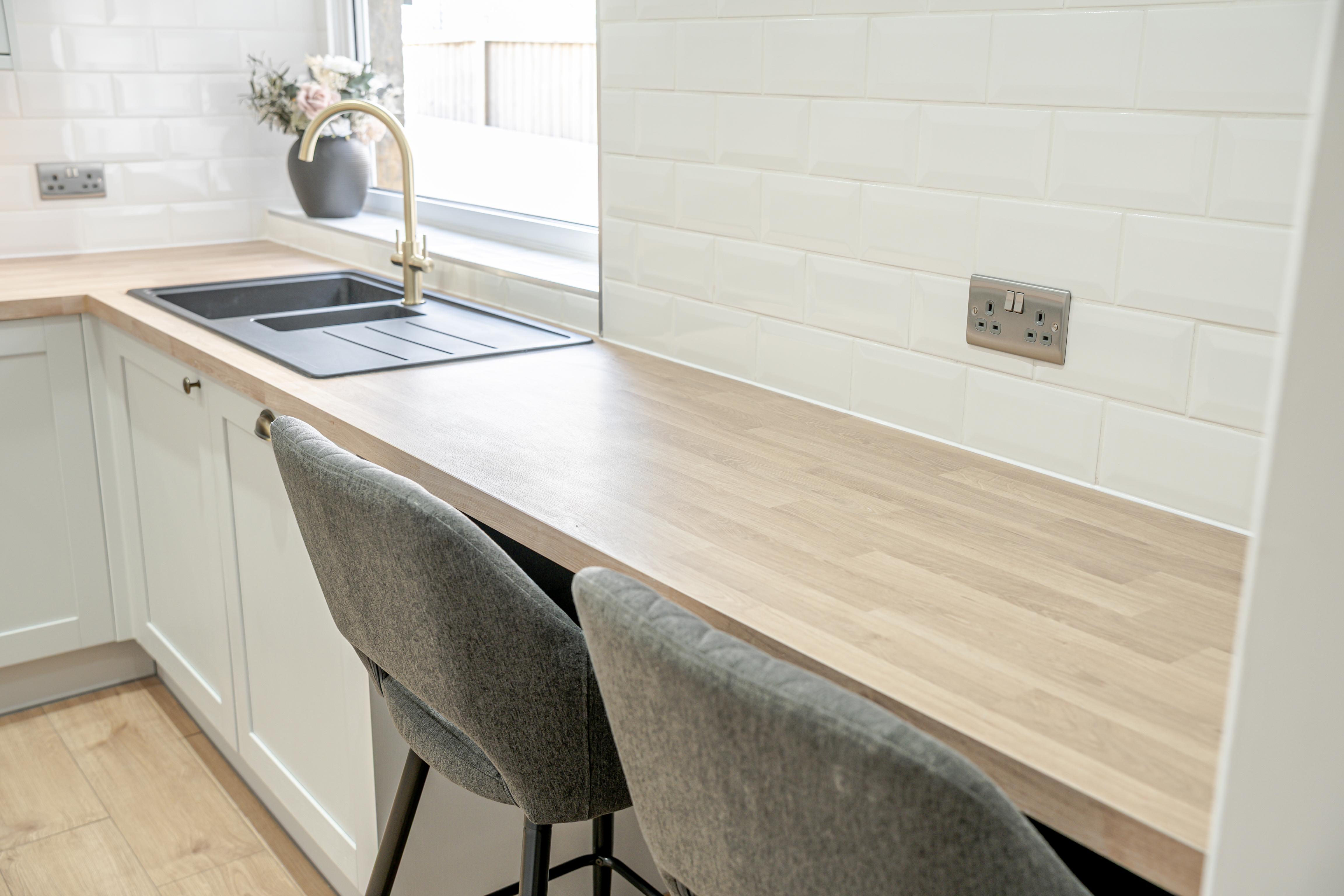 Completing the ground floor is a stylish modern kitchen fitted with contemporary units, a breakfast bar, and ceiling spotlights, creating a practical and attractive cooking space.