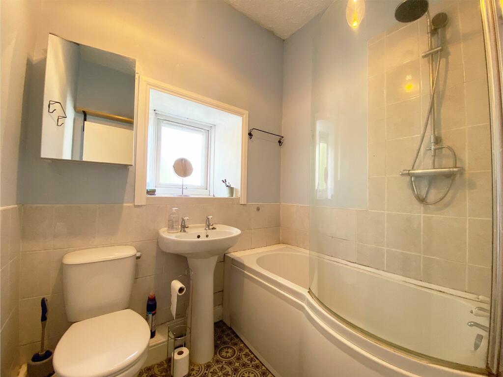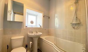 With a frosted PVCU double glazed window, ceiling light point, central heating radiator, part-tiled walls and fitted with a suite comprising panelled bath with curved shower screen and chrome shower fitting incorporating fixed shower rose and separate hand spray, pedestal wash basin and low flush WC.