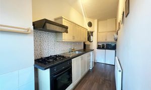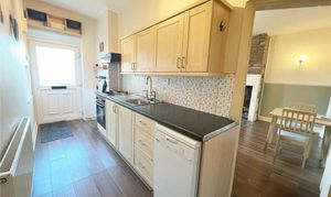 With PVCU and frosted double- glazed door, there is PVCU frosted double-glazed window to the side elevation, ceiling light point, central heating radiator, laminate flooring which continues throughout the ground floor and fitted with a range of shaker style wall and base cupboards, drawers, contrasting over lying worktops with tile splashbacks, inset single drainer stainless steel sink with mixer tap, four ring gas hob with extractor hood over and electric oven beneath together with under counter space for appliances. To one side door opens into the living room.