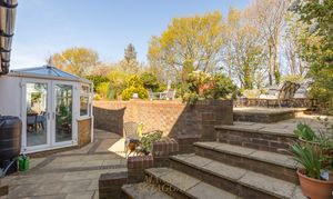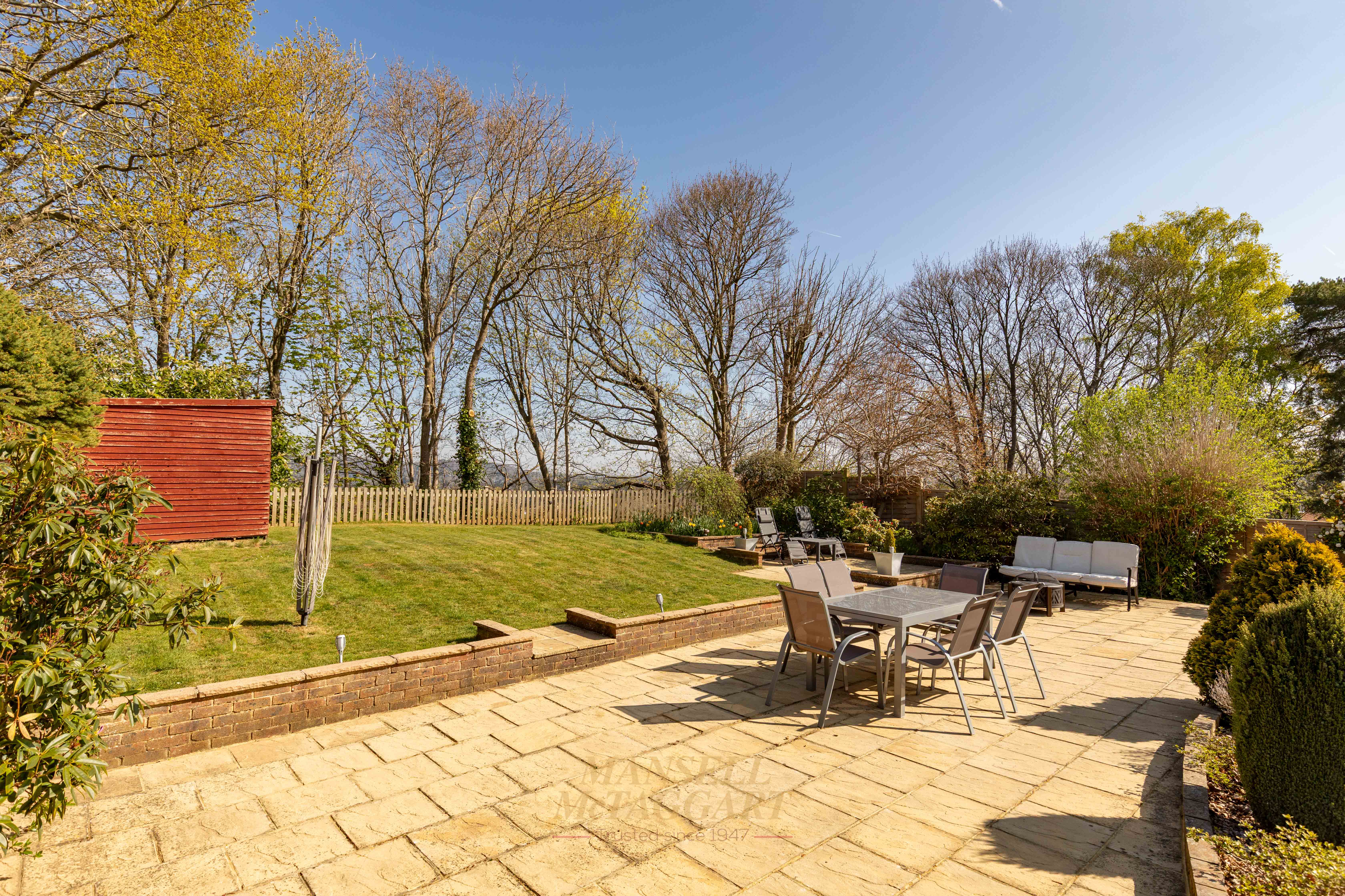 The sunny, terraced rear garden is not overlooked and is ideal for relaxing and socialising with friends and family. There is picket fencing along the rear boundary, and the land beyond drops away sharply into the valley with only the wildlife as near neighbours! There are far-reaching views with St Mary’s Church and Reigate Hill in the distance. In the summertime, the garden is more enclosed with an even greater sense of total privacy when the trees are in whole leaf. A brick and paved patio runs the full width of the house, accessed from both ends of the conservatory and also from the utility room, and it presently has a small table and chairs. A curved brick retaining wall has steps at each end leading up to the next level. There is another larger terraced area that can be used for outside dining, BBQS and entertaining. There is a further seating/sunbathing area, an expanse of lawn with a useful garden shed to the left. There are trees, shrubs and flowers, including established rhododendrons and lovely weeping willows within a flowerbed.
