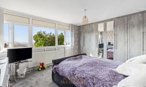 Moving along, another short flight of stairs leads to the first-floor accommodation, with the master bedroom to the right overlooking the front of the house. Given the property's location and all the benefits of a quiet cul-de-sac, stunning panoramic views exist. It is a large room currently with a king-size bed, and along one wall, there are four double built-in wardrobes, two of which are mirror-fronted.