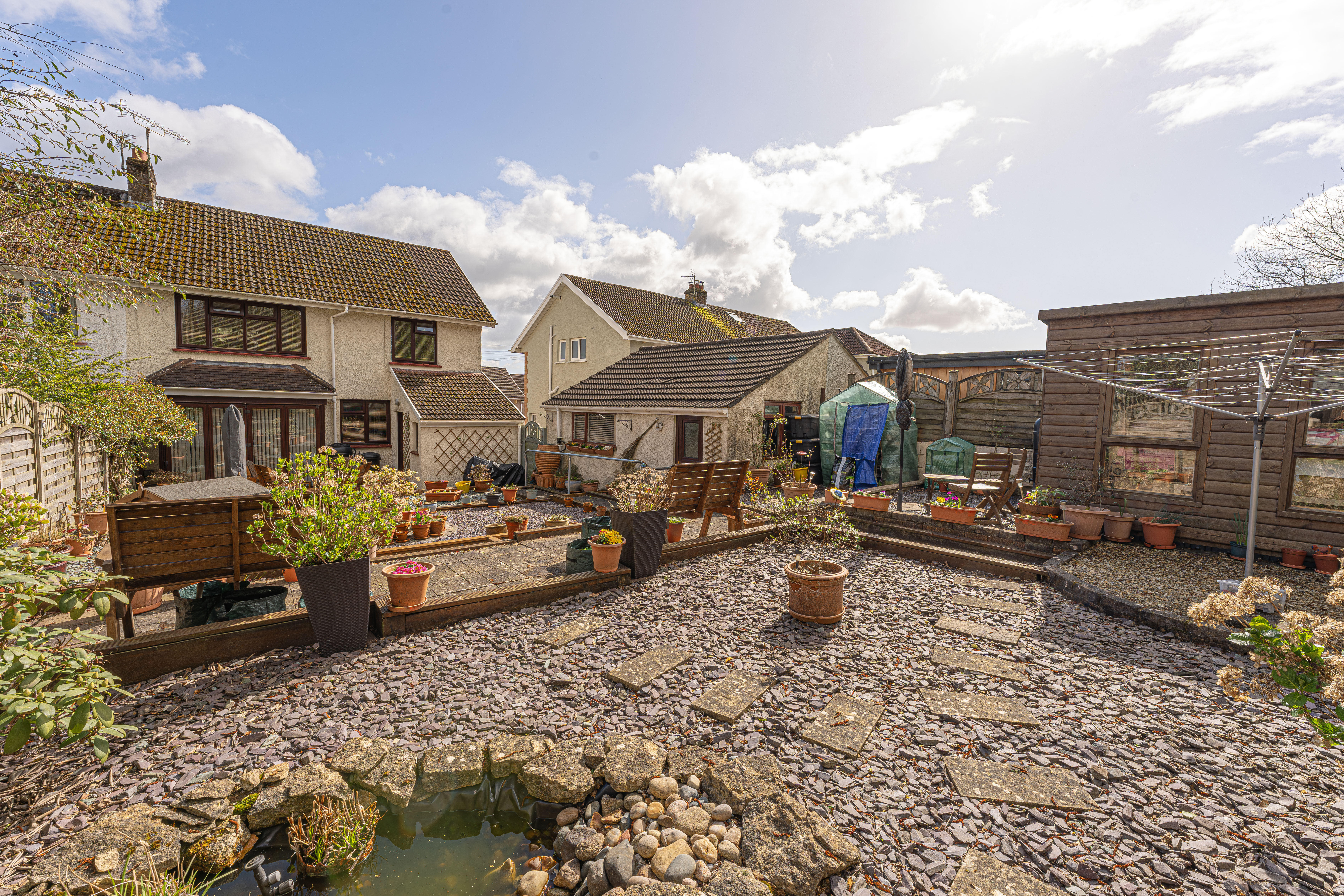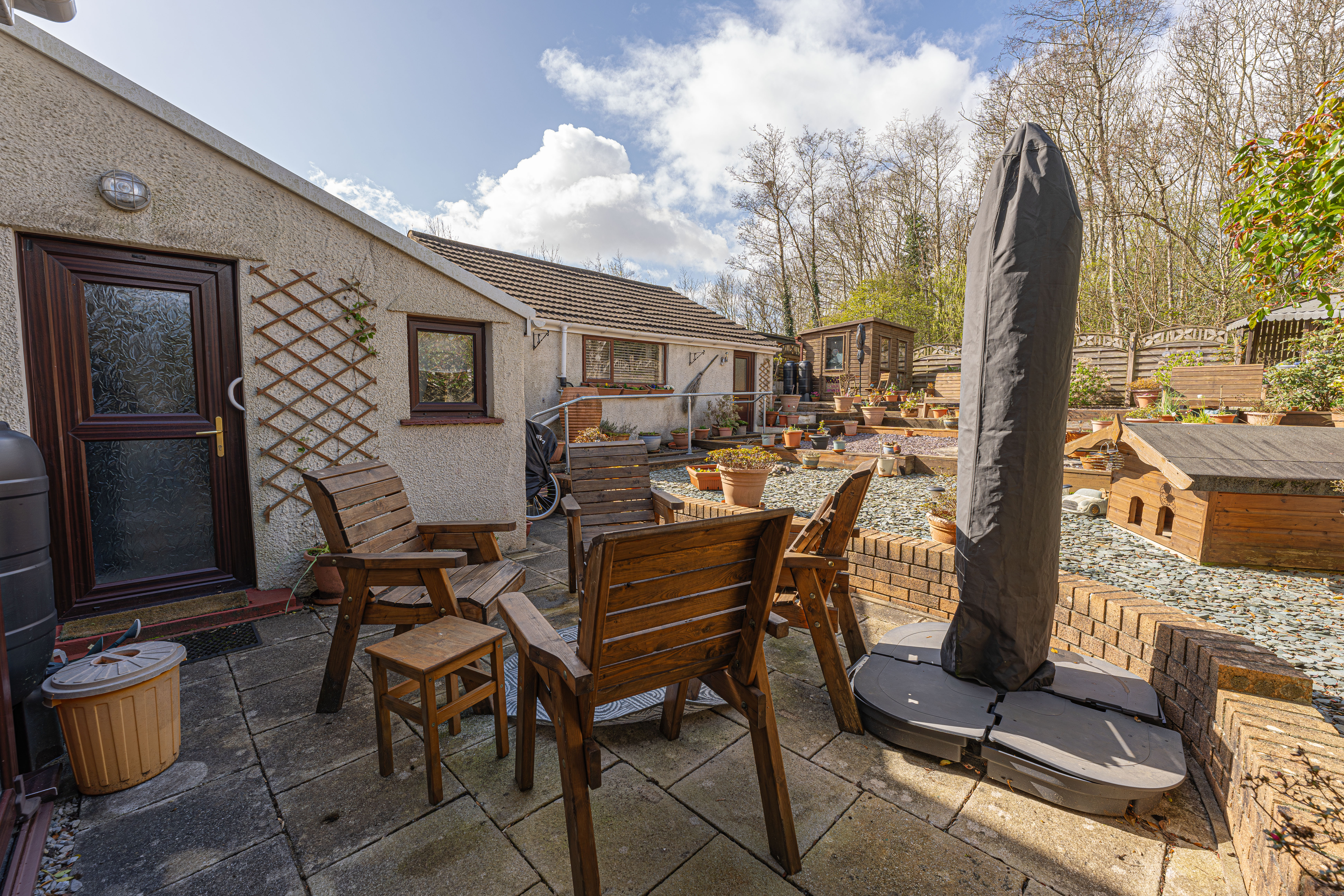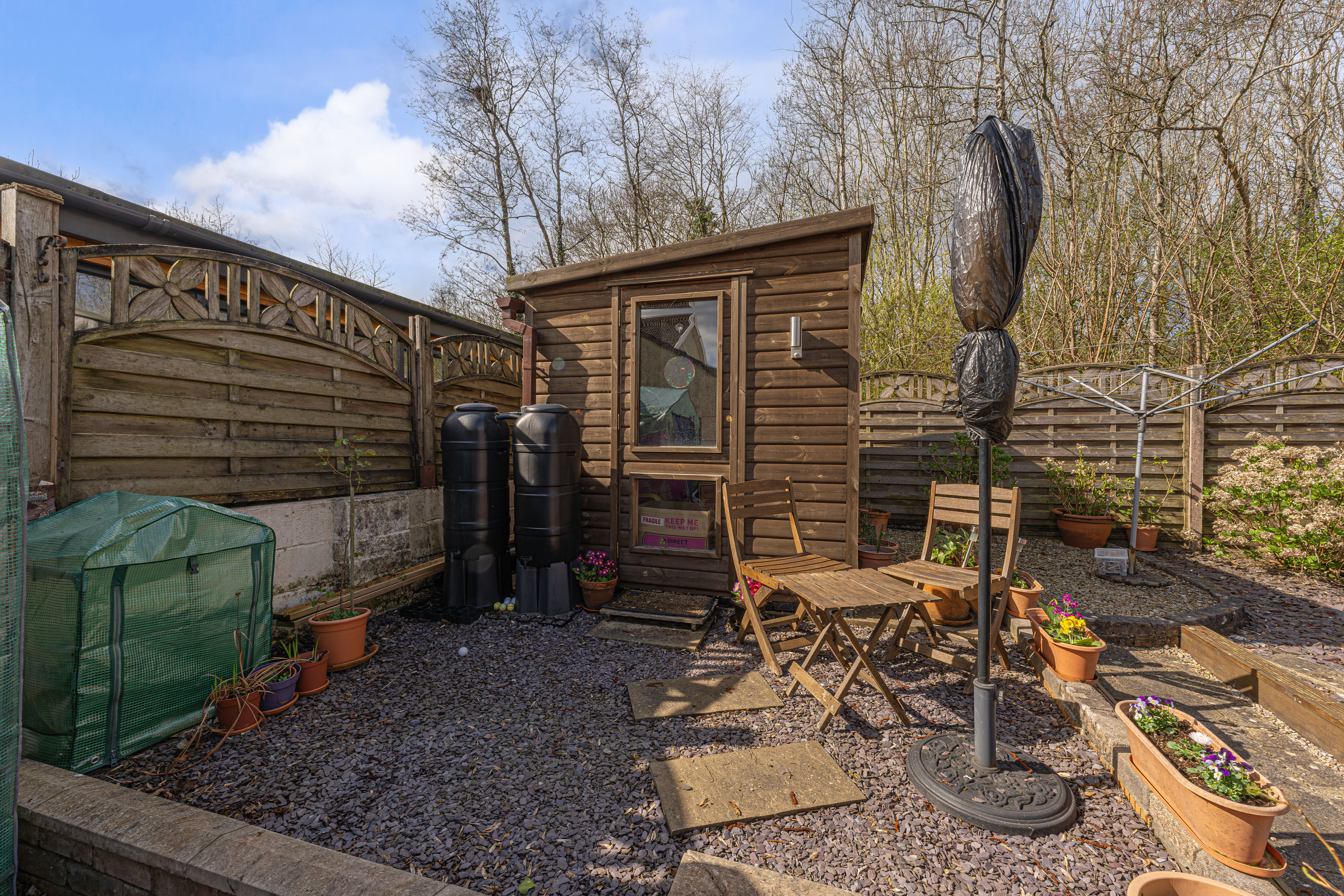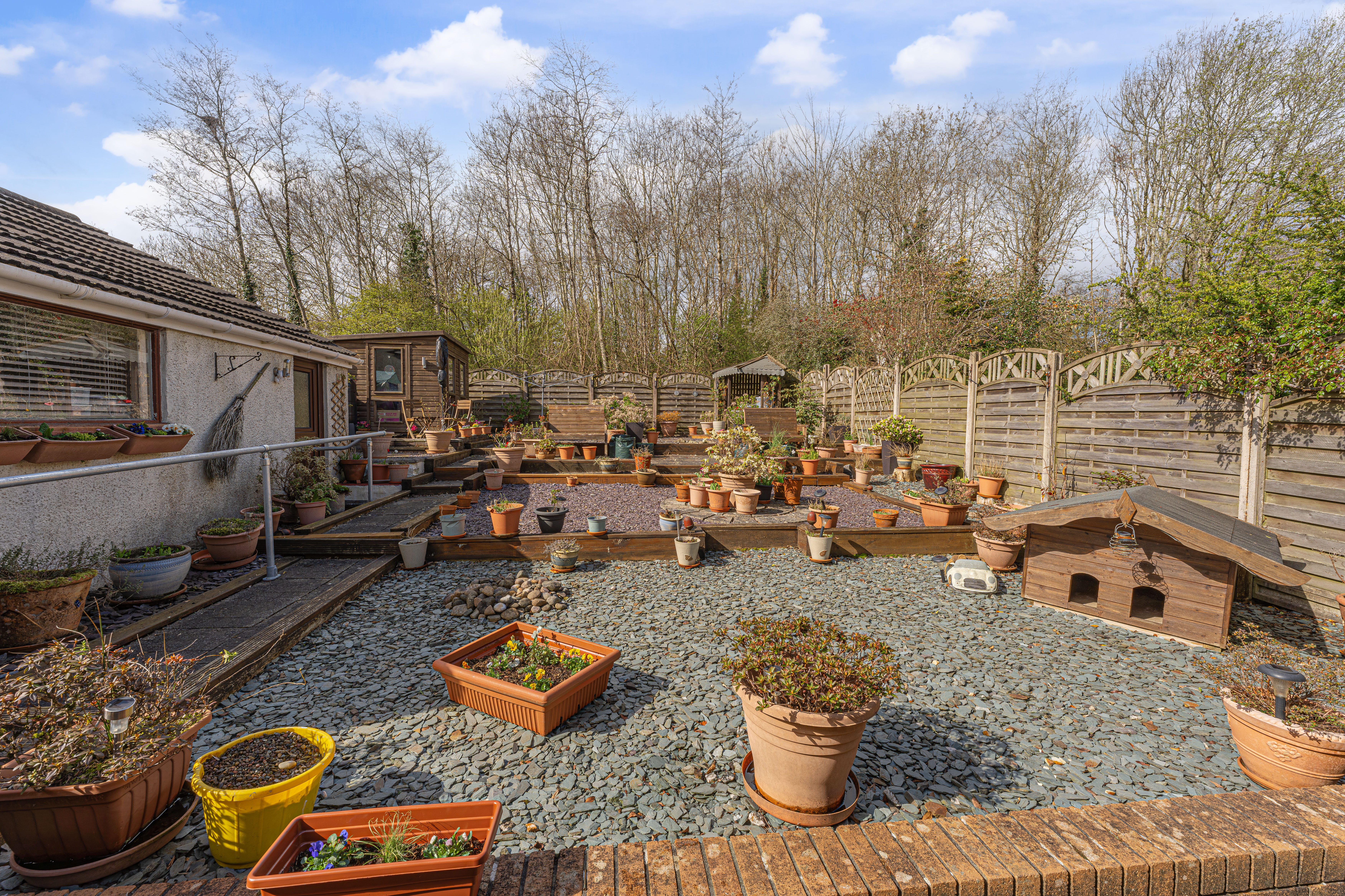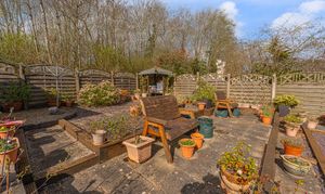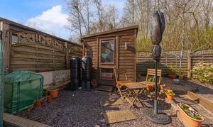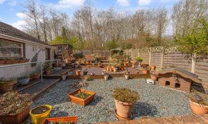 The beautifully landscaped south facing garden sits at the rear of the house, and offers a wide range of space for residents to enjoy. The garden is fully enclosed, and complete with decorative pathways, a pond, and many patio areas ideal for lounging in the sunshine, catching up with friends and family, and dining al-fresco style. A helpful cabin with built in electricity and insulation was erected approximately 4 years ago by a local tradesman and is currently used by the owner as a peaceful environment for relaxing. The detached garage provides added storage and sheltered parking. Additional off-road parking is available with a large driveway to the front and side of the house, offering parking space for at least 3-4 vehicles.