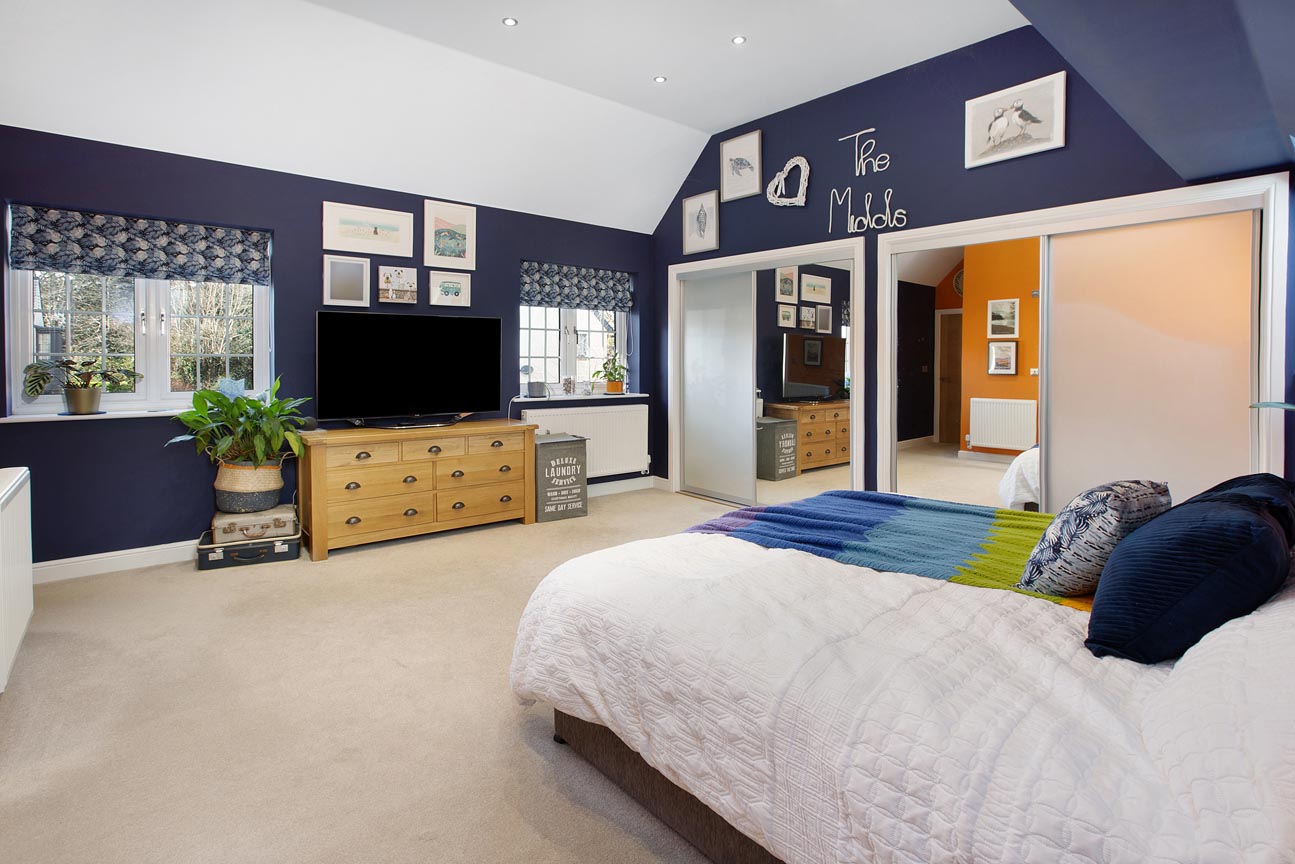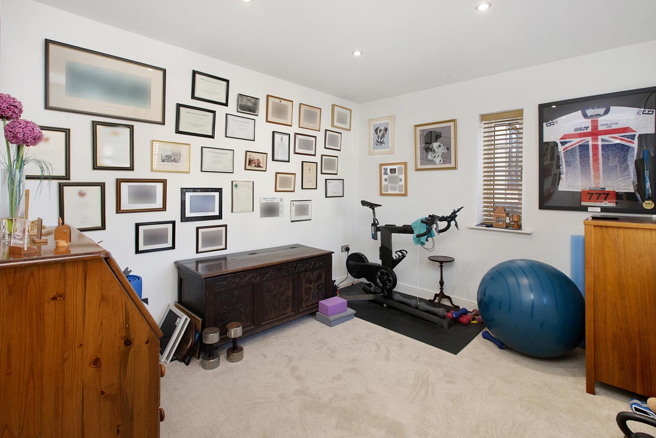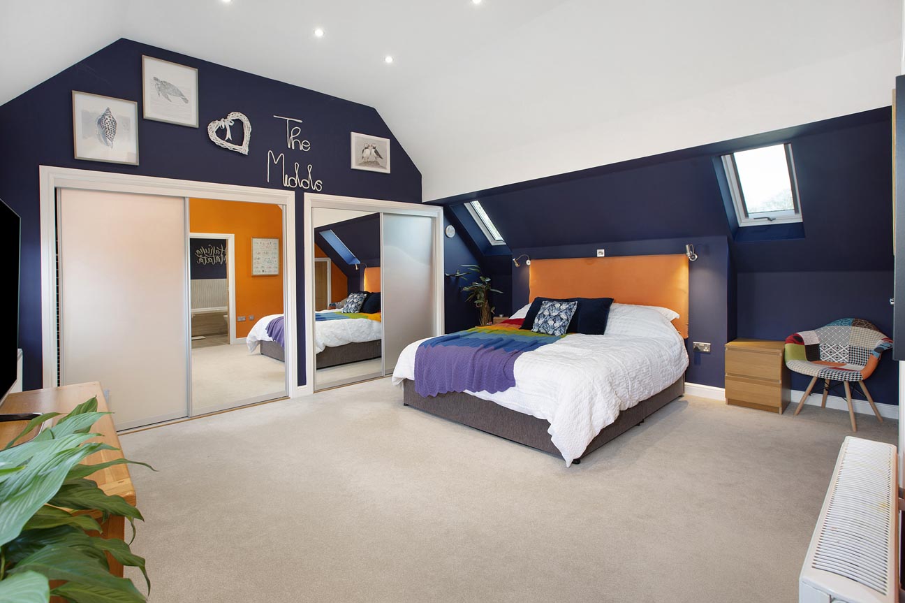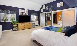 Upstairs, the impressive landing provides access to all four bedrooms. The main bedroom is a beautifully designed double room, mirroring the size of the downstairs double garage. It features vaulted ceilings, built-in his and hers wardrobes, and easily accessible eaves storage. The room also benefits from a spacious En-suite bathroom complete with WC, wash basin, heated towel rail, bath and separate shower. From the landing there are two very handy storage cupboards. One is ideal for airing and drying linens, while the other provides useful space for storing cleaning equipment and household appliances. Bedroom two is another generous double bedroom and features a charming Juliet balcony overlooking the far-reaching countryside. This room also has a door to the Jack and Jill bathroom, which is fitted with a WC, wash basin, heated towel rail, bath and separate shower. Bedroom three is very similar in size to bedroom two and is also a spacious double room. It benefits from a Juliet balcony, a built-in wardrobe and its own En-suite shower room featuring a WC, wash basin, heated towel rail and shower cubicle. Finally, bedroom four is currently arranged as a home gym and office but is another excellent-sized double bedroom overlooking the front of the property.