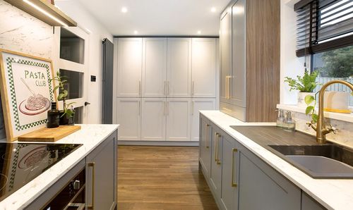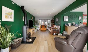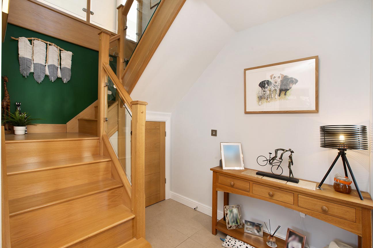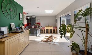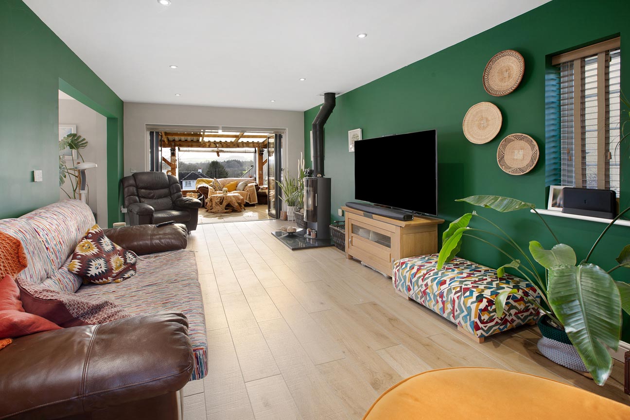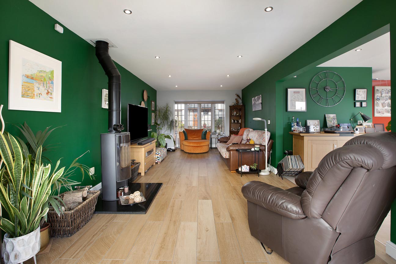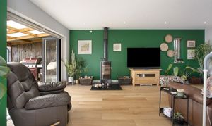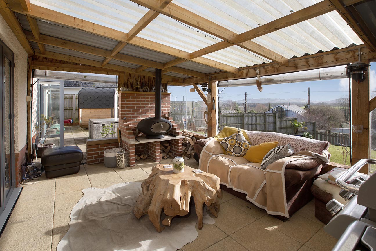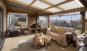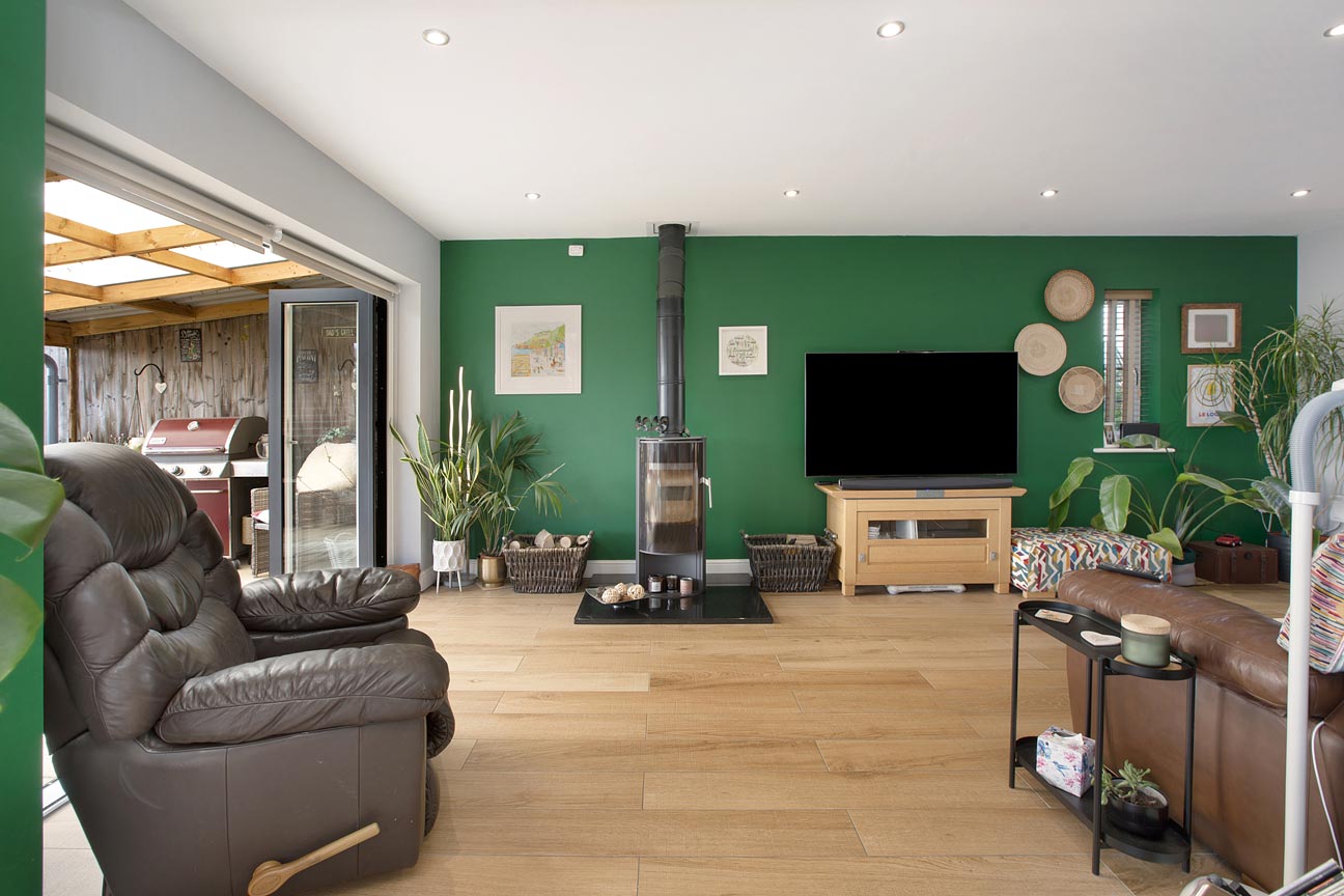 As you enter the property, you are welcomed into a bright and spacious hallway which immediately sets the tone for the rest of the home. An exceptional oak and glass staircase leads to the first floor, and there is also a convenient understairs storage cupboard. To the left of the hallway is a tastefully decorated downstairs WC, fitted with a toilet, wash basin. A glass door then leads through to the impressive open-plan living space, where Porcelanosa flooring runs throughout and underfloor heating provides comfort across the entire ground floor. The sleek, contemporary kitchen is centred around a large island with an induction hob, contemporary extractor located above the hob and ample space for seating, creating a perfect social hub. The kitchen is fully fitted with integrated appliances including a fridge, freezer, dishwasher, double oven with plate warming drawers, microwave, coffee machine and wine cooler. Just off the kitchen is the utility room, offering space for a washing machine and tumble dryer, along with an additional door providing access to the rear garden. Continuing from the kitchen, the dining area provides plenty of space for a family-sized table and chairs, with bifold doors opening directly onto the garden. The home continues to impress as you move into the lounge, which truly forms the heart of the property. This inviting space features a beautiful log burner and a bay window, creating a warm and relaxing atmosphere. Another set of bifold doors leads out to the covered garden room. This fantastic entertaining space benefits from being brick and oak built with a solid roof, glass panels to the side and café blinds that can be rolled up during the summer months to create an open outdoor entertaining area. The space also features a built-in pizza oven and ample room for seating and relaxation.