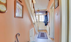 With stairs to the first floor, laminate flooring, an under-stairs storage cupboard, and a radiator.