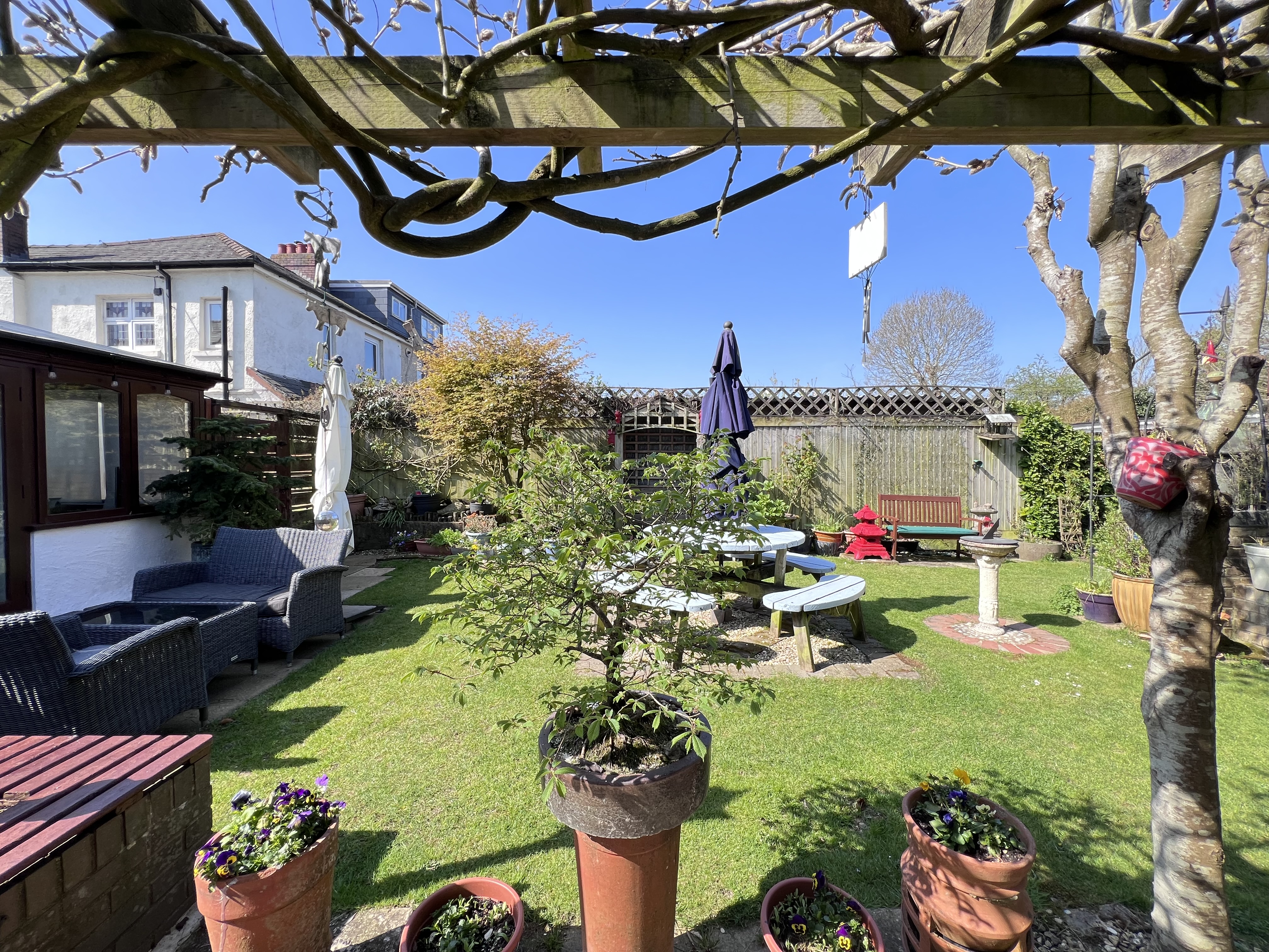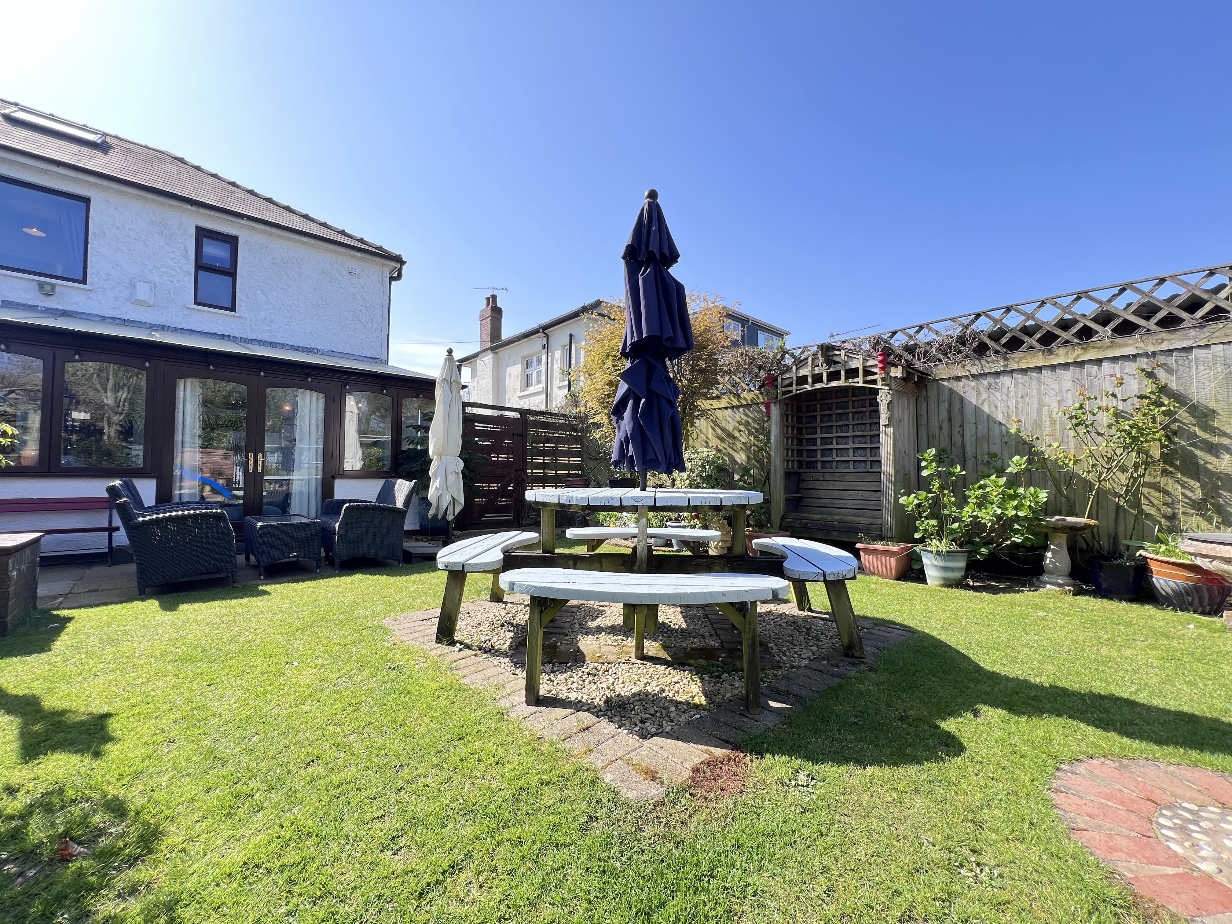 A beautiful rear garden, fully enclosed and with a wealth of well maintained shrubs, trees and plants. A beautiful pergola and walkway covered with wisteria. Well manicured lawn and multiple patio and seating areas. Greenhouse plus summer house / office.