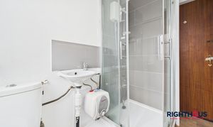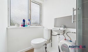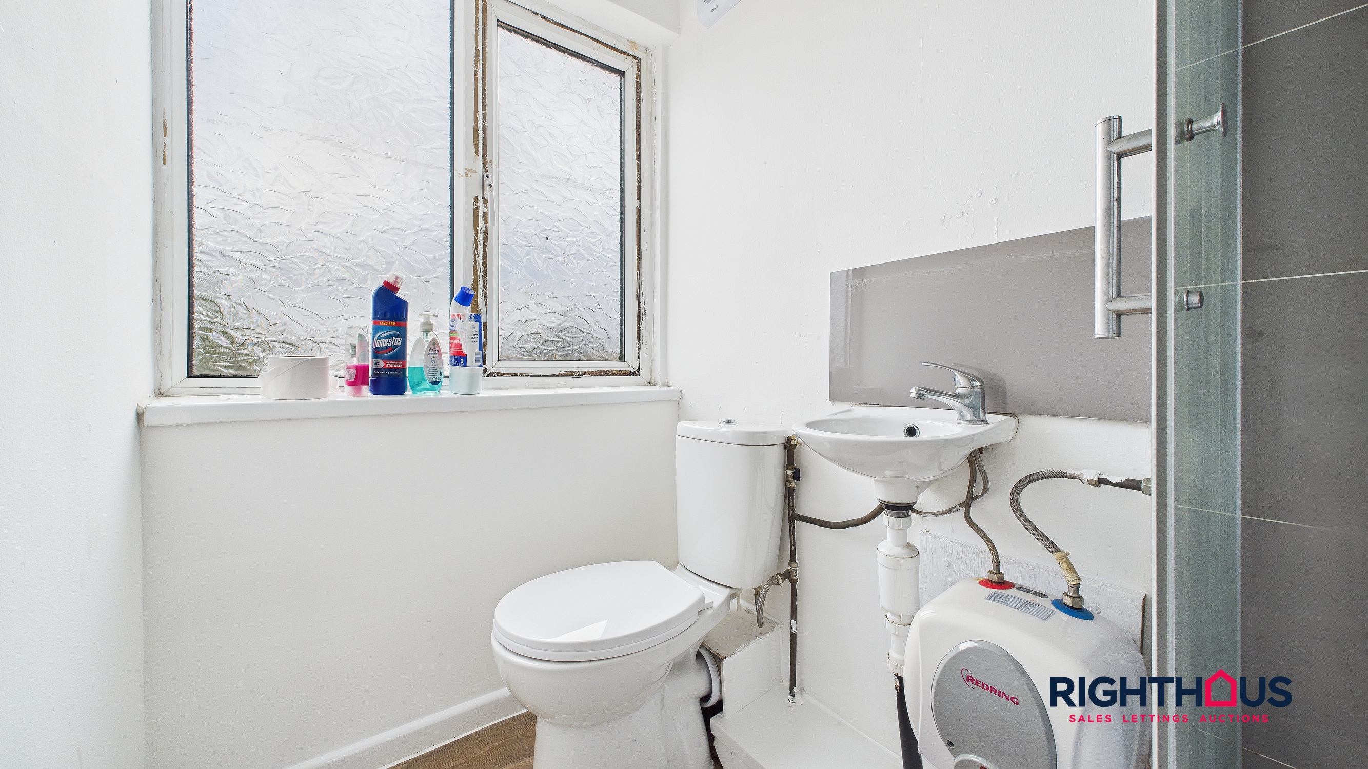 The bathroom boasts a compact, practical layout with a modern shower unit and a privacy-enhancing frosted window, ensuring comfort and functionality. Neutral decor and a modern carpet throughout.