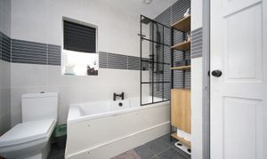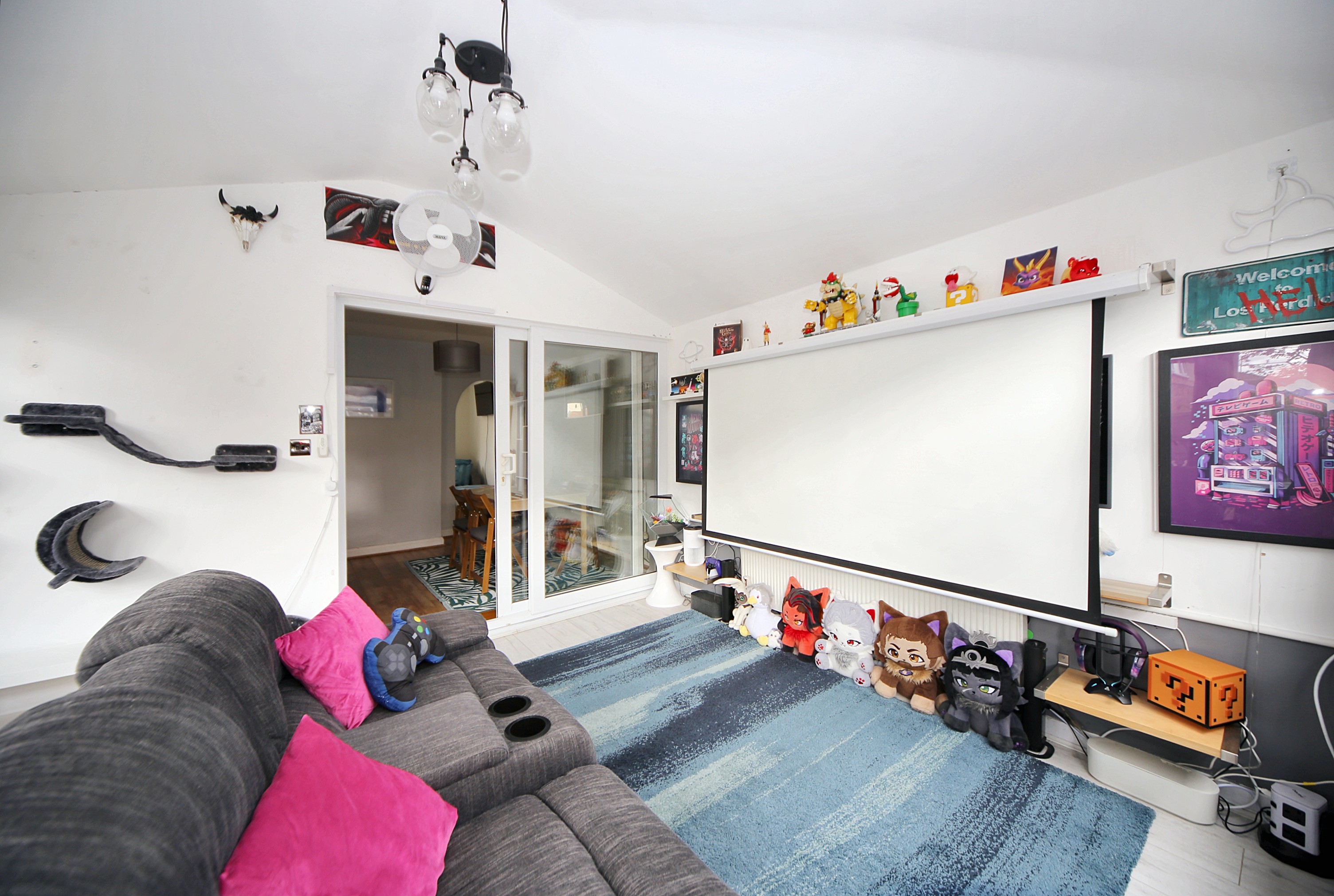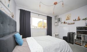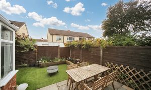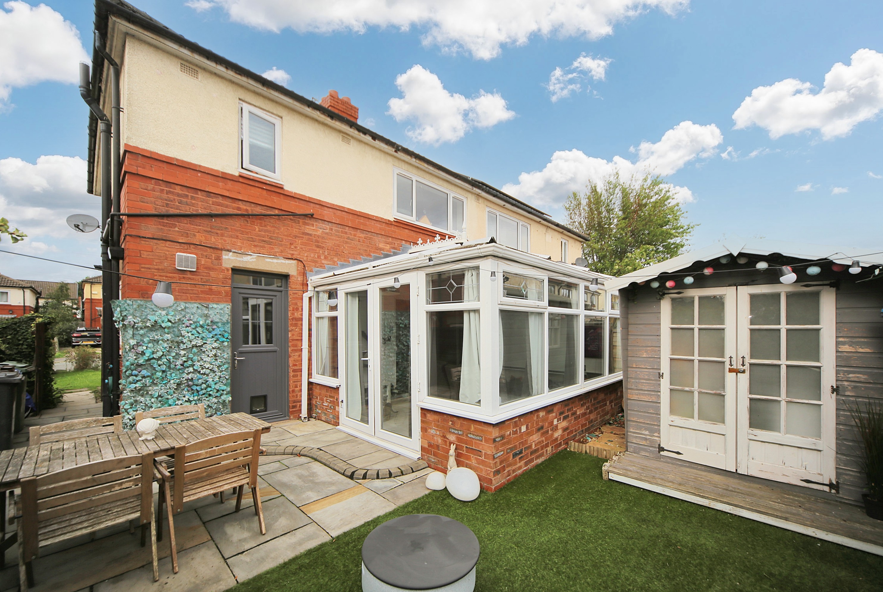 The garden is attractively landscaped with an Indian stone patio, artificial lawn, raised railway sleeper borders and a shed with electric supply, ideal for storage or hobbies.