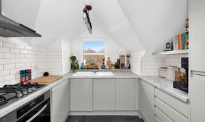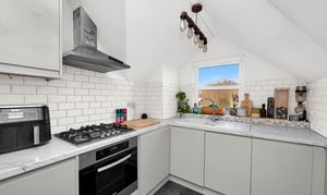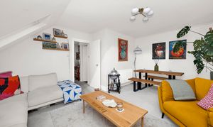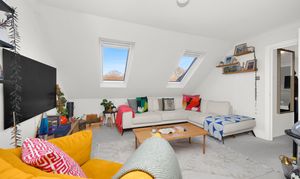 The accommodation comprises a welcoming entrance hall with large built-in storage, a bright dual-aspect reception room with ample space for both living and dining, a modern separate fitted kitchen with integrated appliances and metro-tiled splashback, a spacious double bedroom, and a contemporary bathroom with skylight. The Velux windows are fitted with integrated blinds.