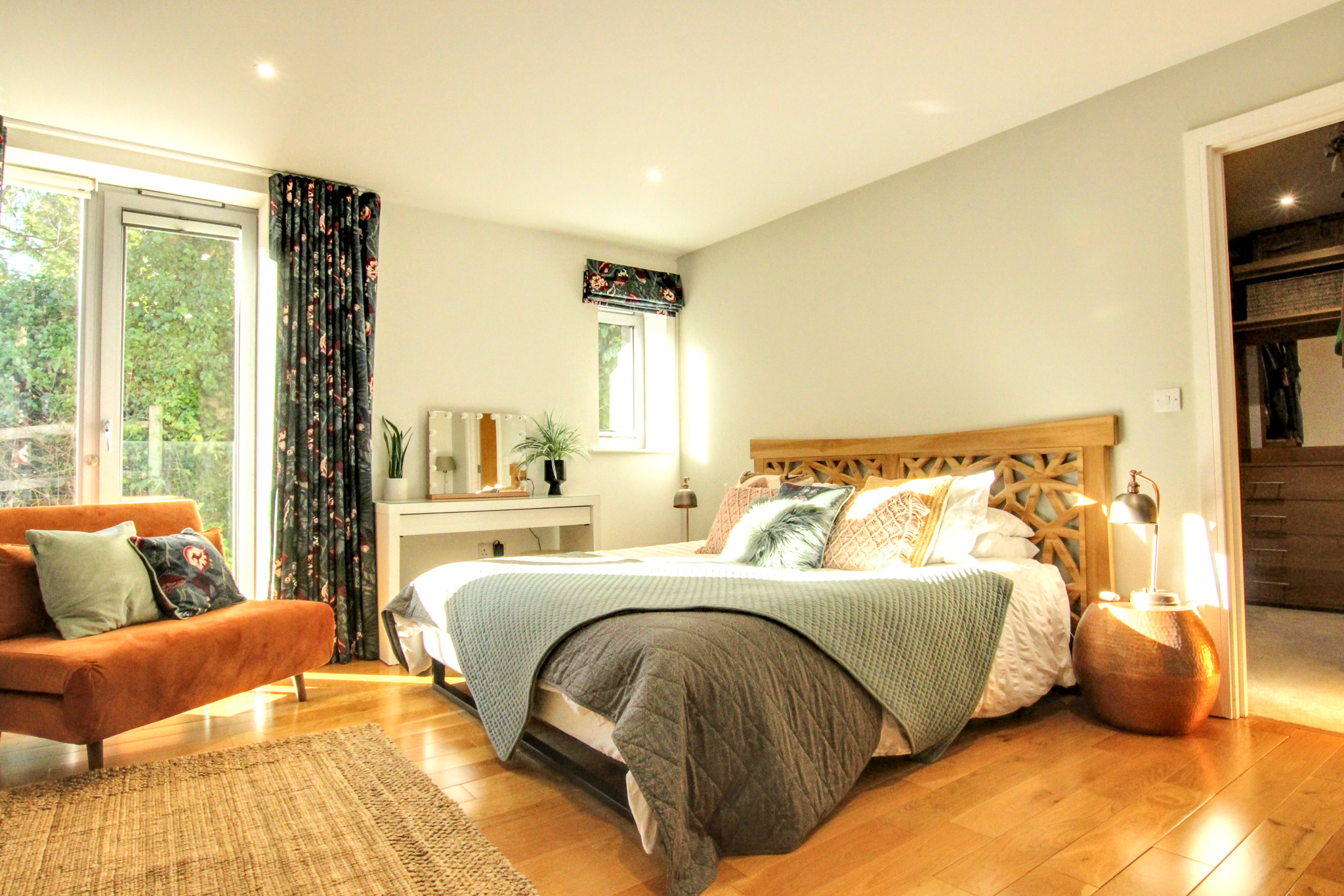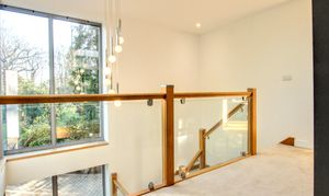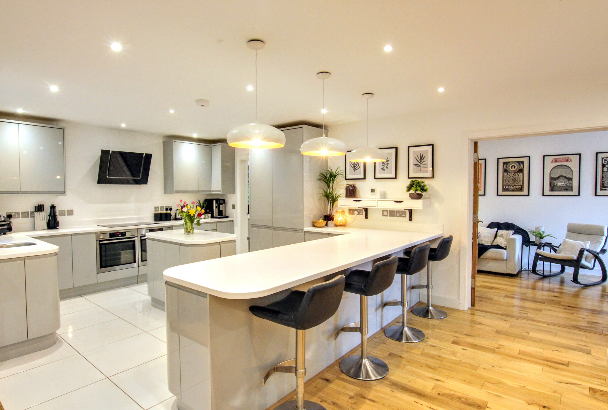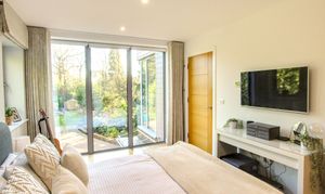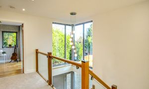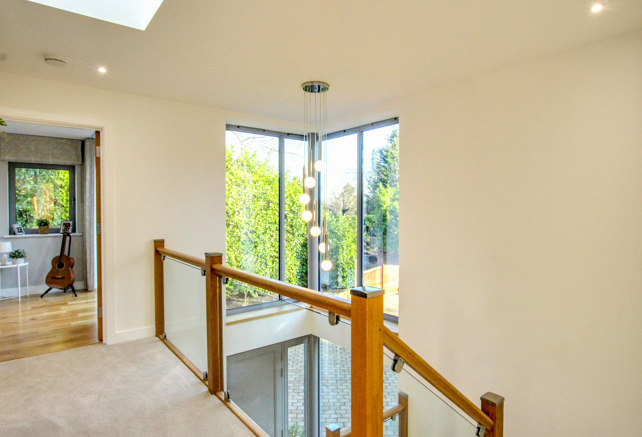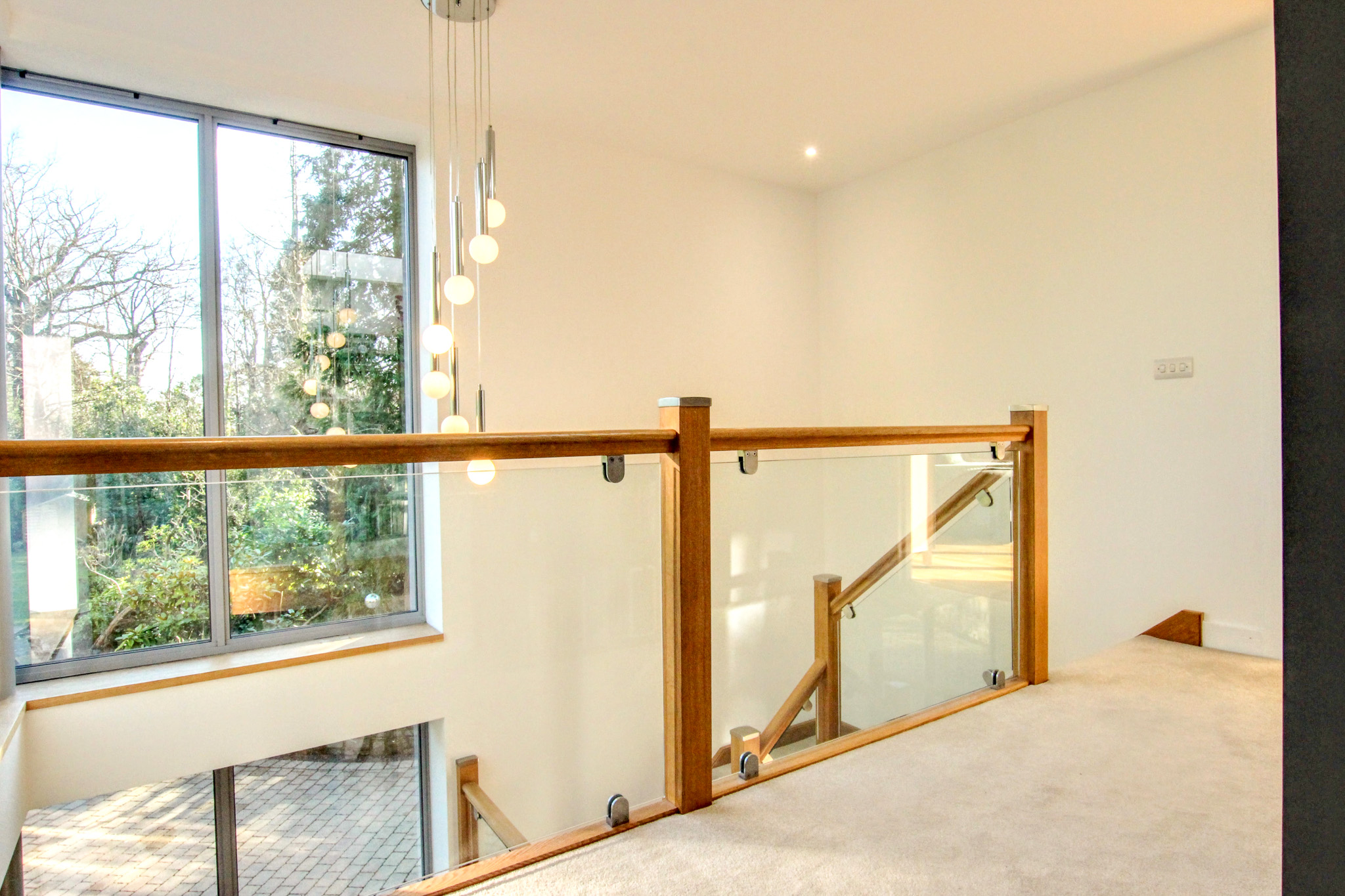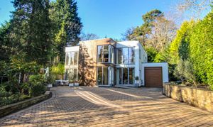 The interior matches the rather impressive ultra-modern exterior with quality fittings, oak flooring, a beautiful kitchen with integrated appliances and Corian worktops, an equally well fitted utility room and plant room with an internal door to the garage, a large open plan living area with woodburning stove and doors out to a terrace overlooking the pond and a separate family room. On the first floor there is a grand master bedroom suite with full length windows overlooking the pond and gardens, an en-suite dressing room and a bathroom. There are three further bedrooms and two further shower rooms.