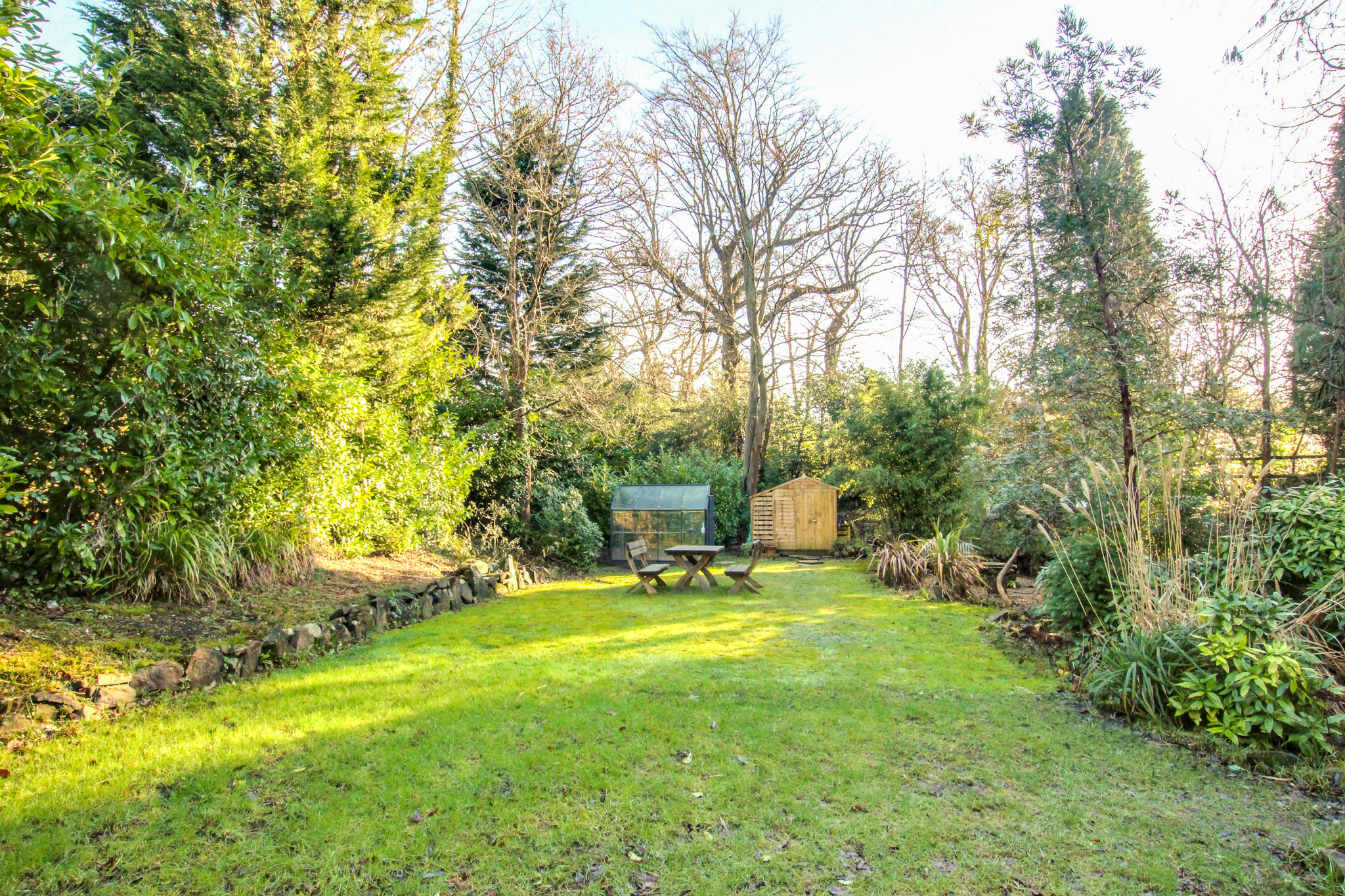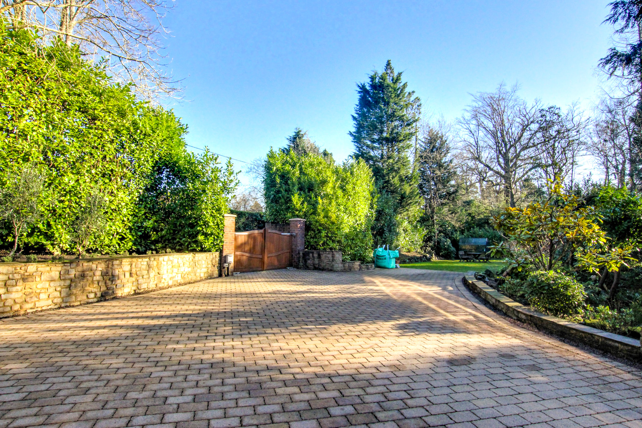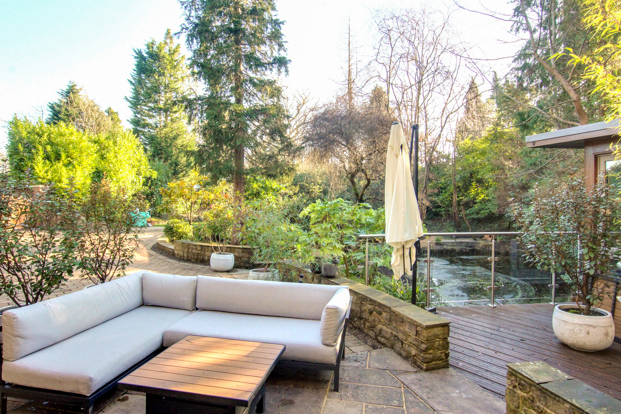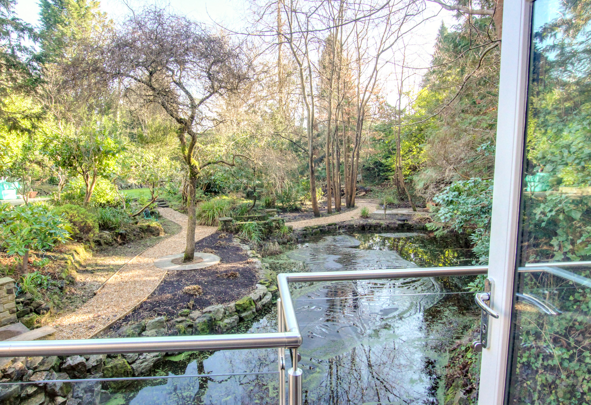Approached from the road through high twin wooden gates which lead to a large parking area in front of the house, the plot is as unique as the house itself and once formed a small sandstone quarry so has a lot of natural stone around the southern boundary and almost botanical gardens with lots of pathways, ornamental plants, areas of lawn and a large pond overlooked by a separate detached garden studio which would make an ideal home office or small gym. To the rear and sides of the house is a terrace and raised bank. The plot offers almost complete seclusion from any neighbour.