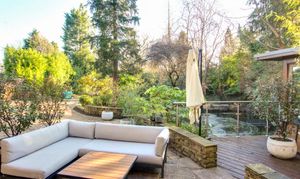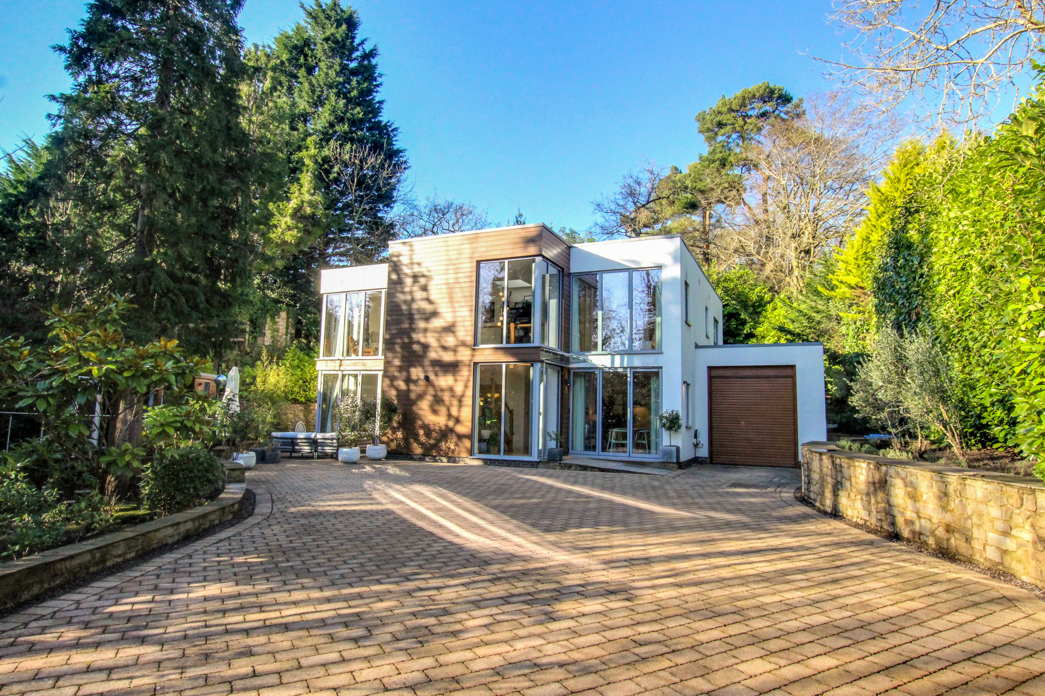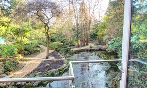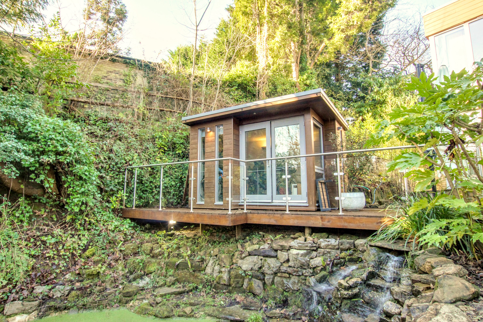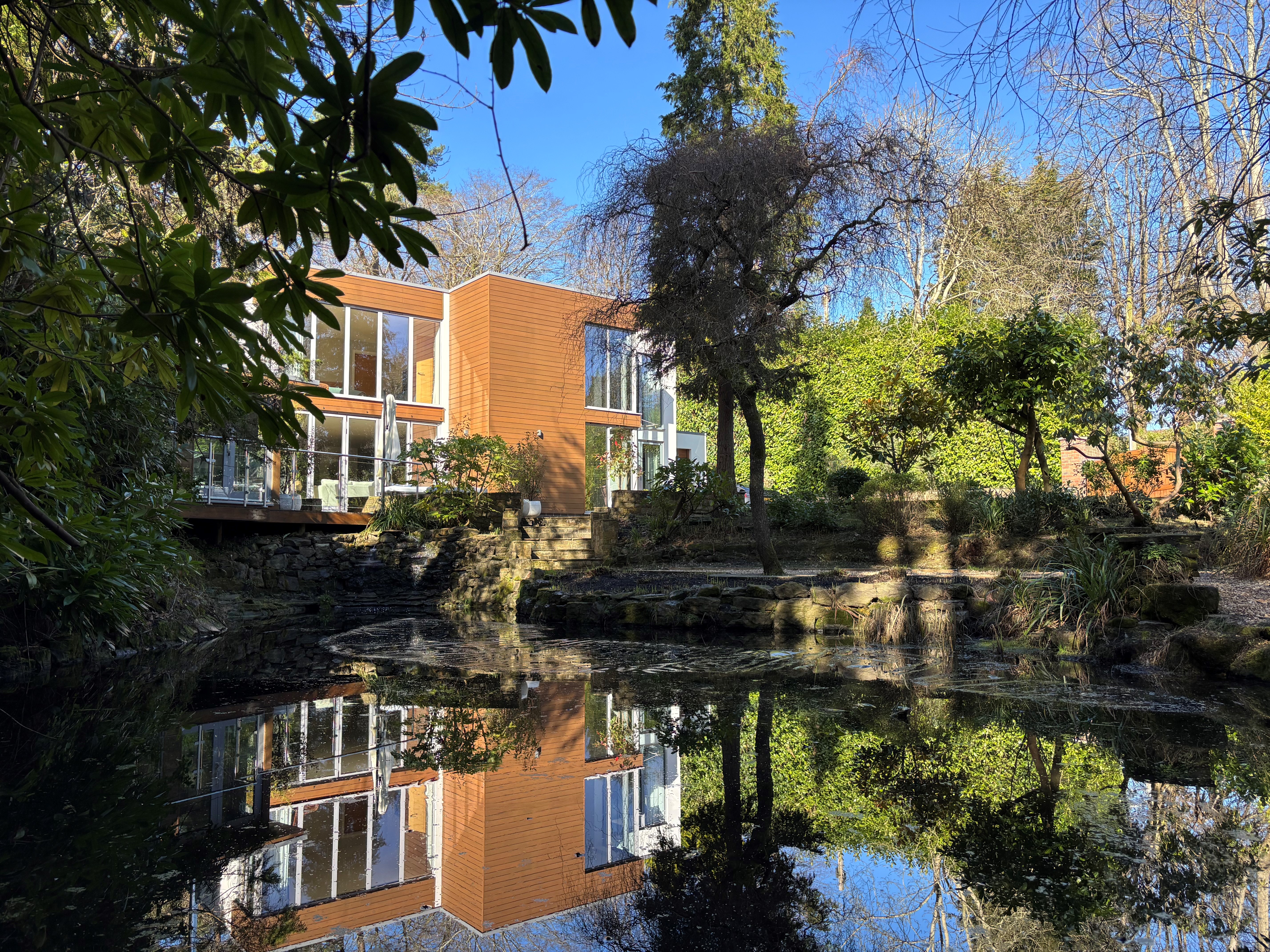 Approached from the road through high twin wooden gates which lead to a large parking area in front of the house, the plot is as unique as the house itself and once formed a small sandstone quarry so has a lot of natural stone around the southern boundary and almost botanical gardens with lots of pathways, ornamental plants, areas of lawn and a large pond overlooked by a separate detached garden studio which would make an ideal home office or small gym. To the rear and sides of the house is a terrace and raised bank. The plot offers almost complete seclusion from any neighbour.