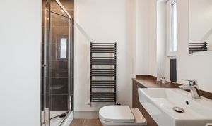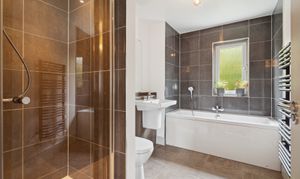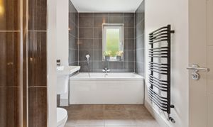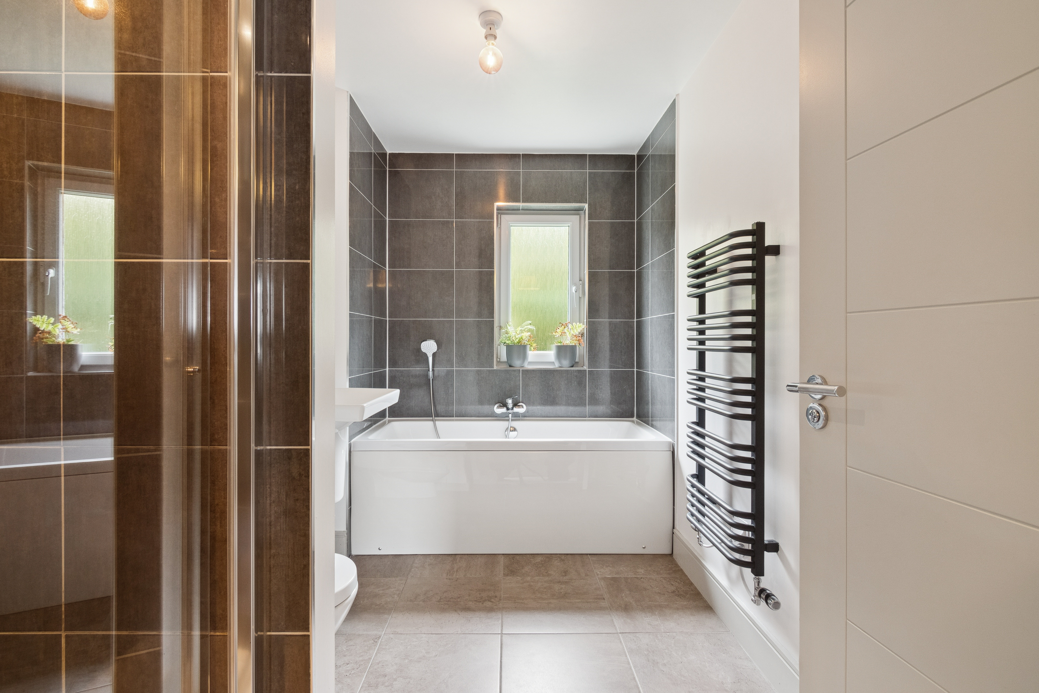 The family bathroom completes the upper level and continues the home’s sense of luxury and space. Partly tiled and tastefully designed, it features a large bath with overhead shower, creating a relaxing and low-maintenance retreat.