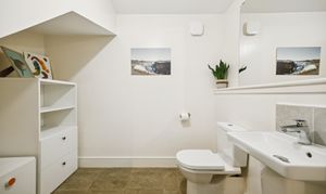 Completing the downstairs layout is a spacious and well-finished WC. It features a large mirror, partial tiling and excellent storage, practical, neutral and ready for the new owner’s personal touch. The large integral garage provides further flexibility, with internal access from the main home and generous storage, the area currently features a utility space, as well as potential for conversion into a home gym, or workshop space.