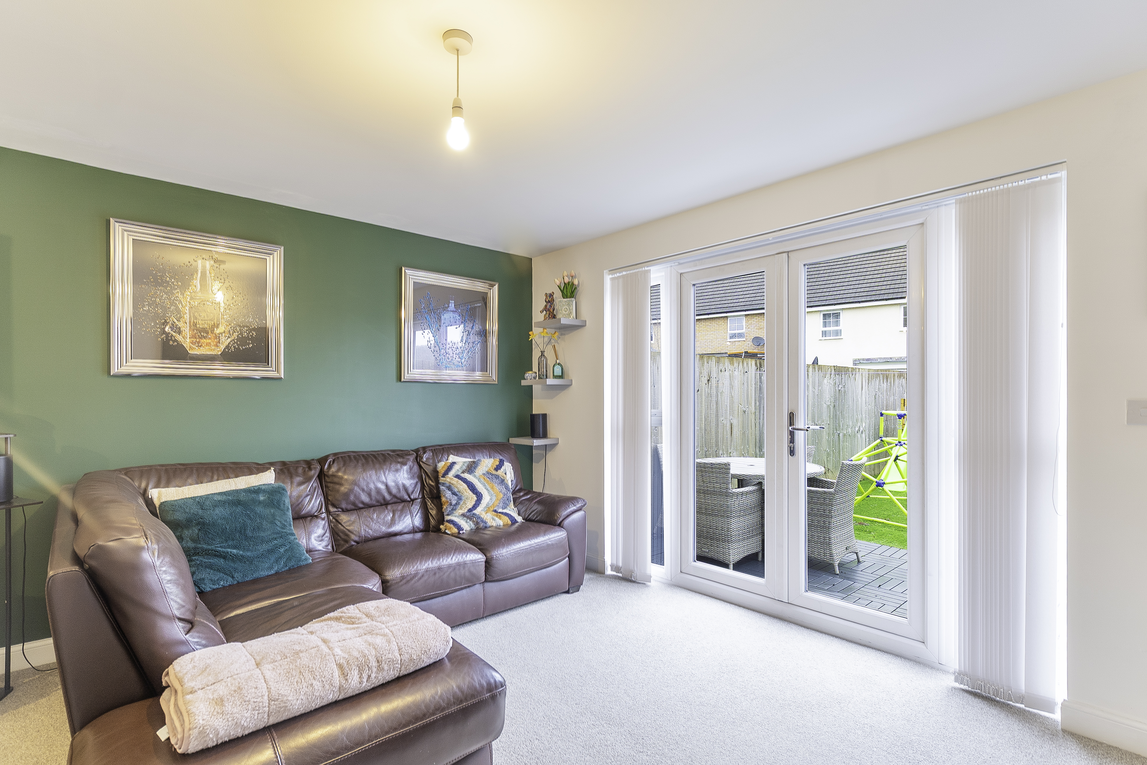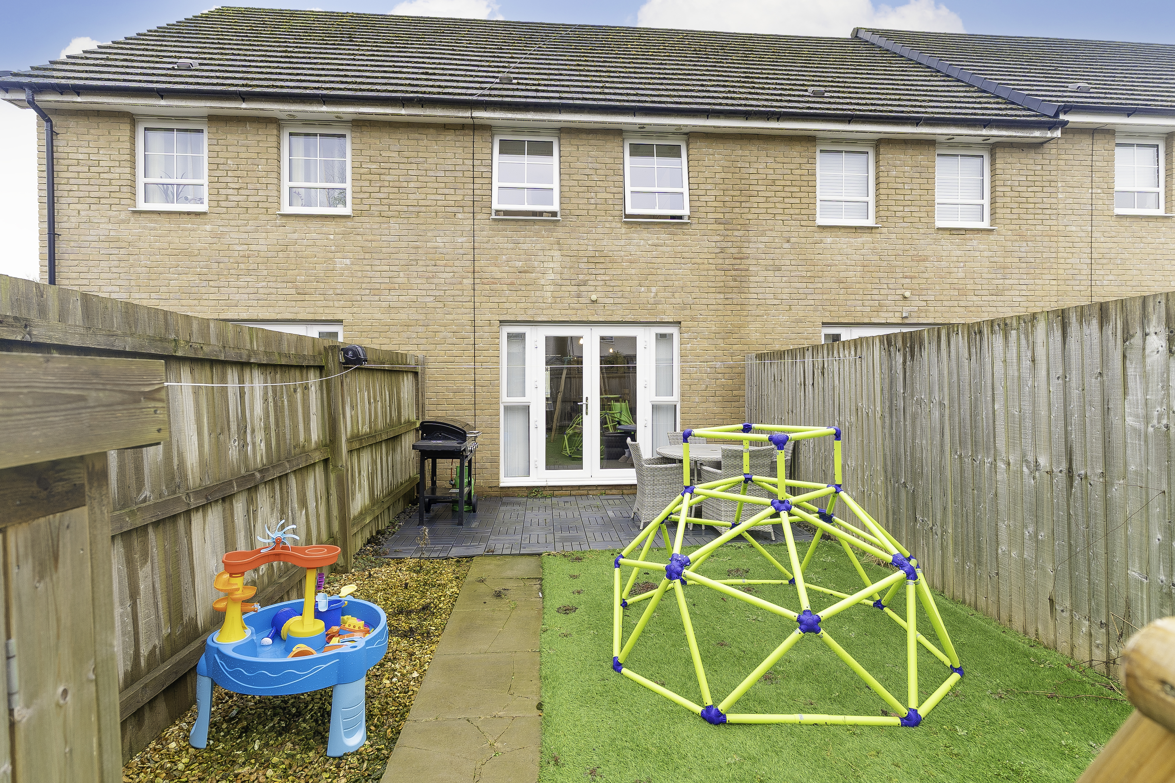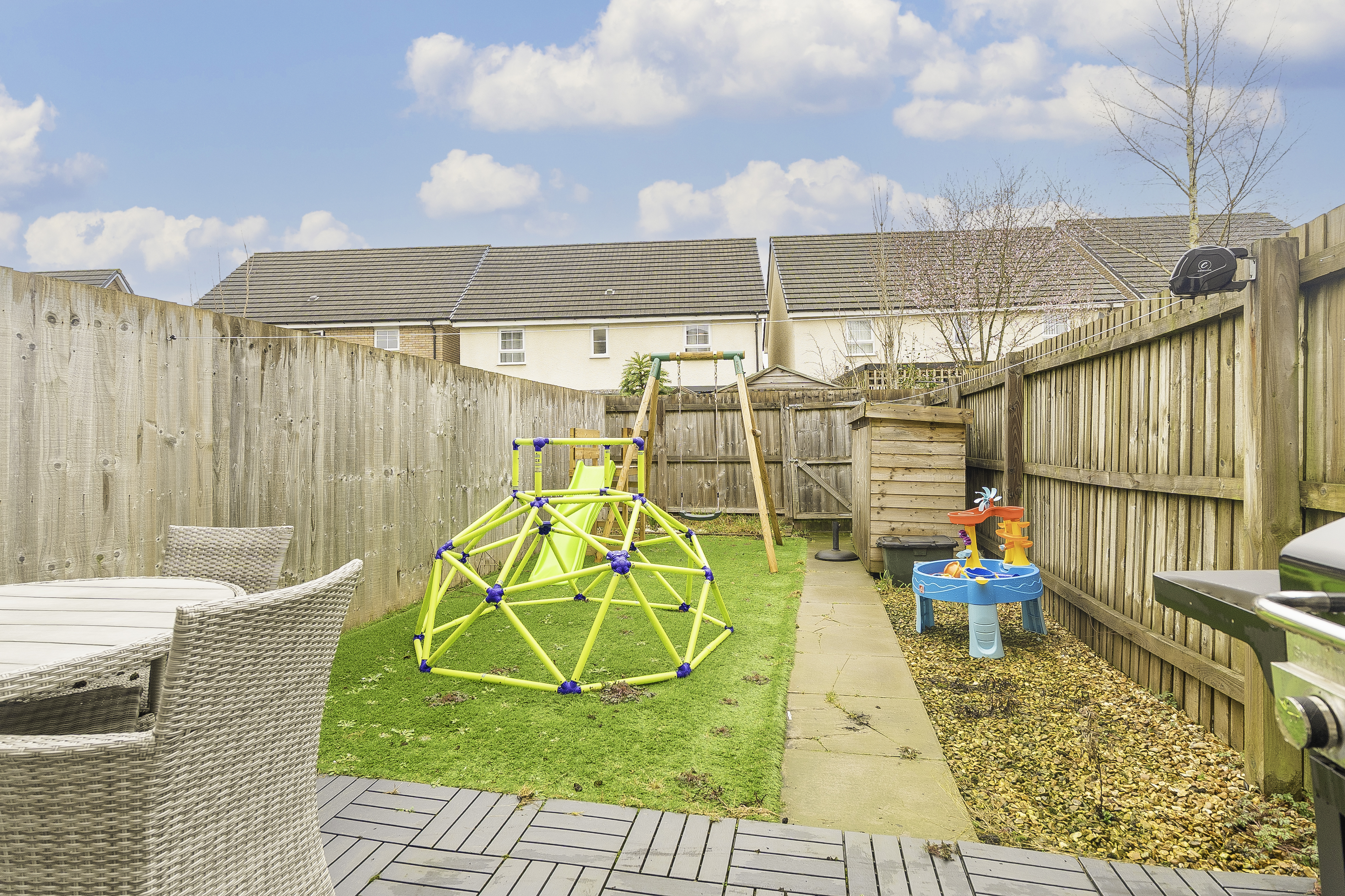 The rear garden is fully enclosed, offering a private and low-maintenance outdoor space. It features a cosy seating area, perfect for relaxing, and rear access for added convenience.