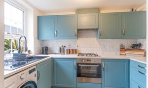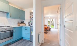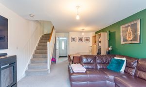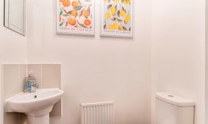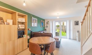 Upon entering the property, you are greeted by a welcoming hallway. Straight ahead is the spacious living area, which provides a comfortable space for both seating and dining. The open-plan staircase adds a touch of charm, and the patio doors leading out to the rear garden fill the room with natural light. To the left of the hallway is a well-appointed kitchen, offering ample storage and generous worktop space, making it a great area for cooking and meal preparation. To the right, you'll find a convenient cloakroom featuring a WC and hand basin, ideal for guests and everyday use.
