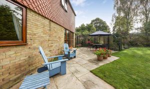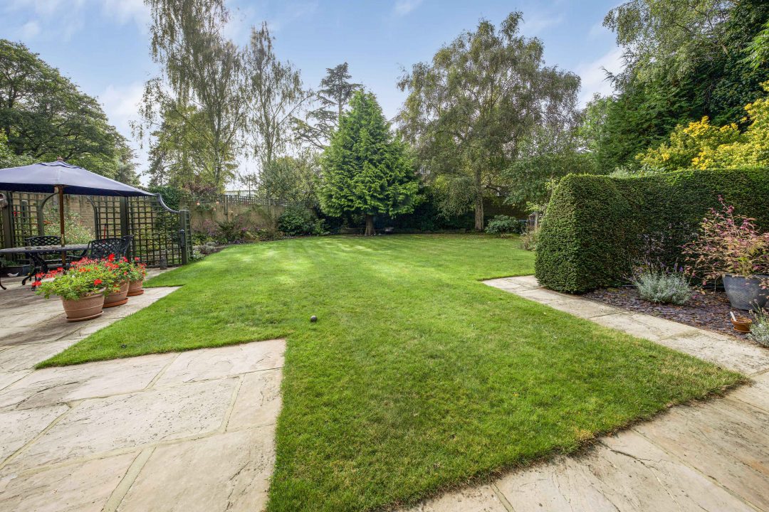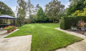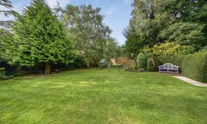 Beautiful and very secluded rear garden with main area laid to verdant grass lawn, feature patio areas to rear and sides of house, planted areas with trellis and hedge screens, rear greenhouse.