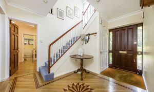 Elegant hall has wood flooring with a central compass rose feature, coatrack and radiator. The atrium style design of the entrance floods the hall with light from the floor to celling windows on the landing above. Door off to cloakroom.