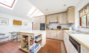Units fitted at eye and base level, worktops and tile splashbacks, inset sink unit, inset hob, inbuilt oven, integral fridge and freezer, integral dishwasher, tiled floor, central island unit, space for table and chairs, radiator in cabinet, windows to frontage and two additional skylight windows over, personal door into garage and door into separate utility.