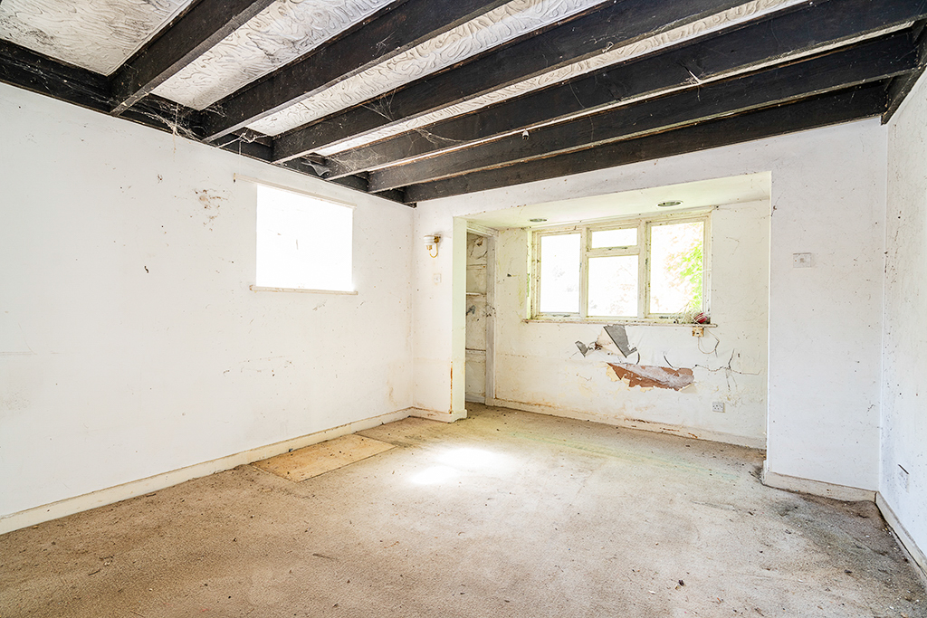 Bay window overlooking the driveway plus window to side aspect. Fireplace (boarded up)