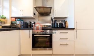 The sleek front kitchen is both stylish and practical, with ample work surfaces, gloss units, and built-in appliances, ideal for cooking and entertaining. To the rear, a bright, generous lounge/dining room flows effortlessly onto the south-facing garden, filling the space with natural light and providing a seamless connection between indoor and outdoor living, perfect for relaxing, entertaining, or watching children play.