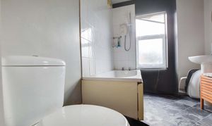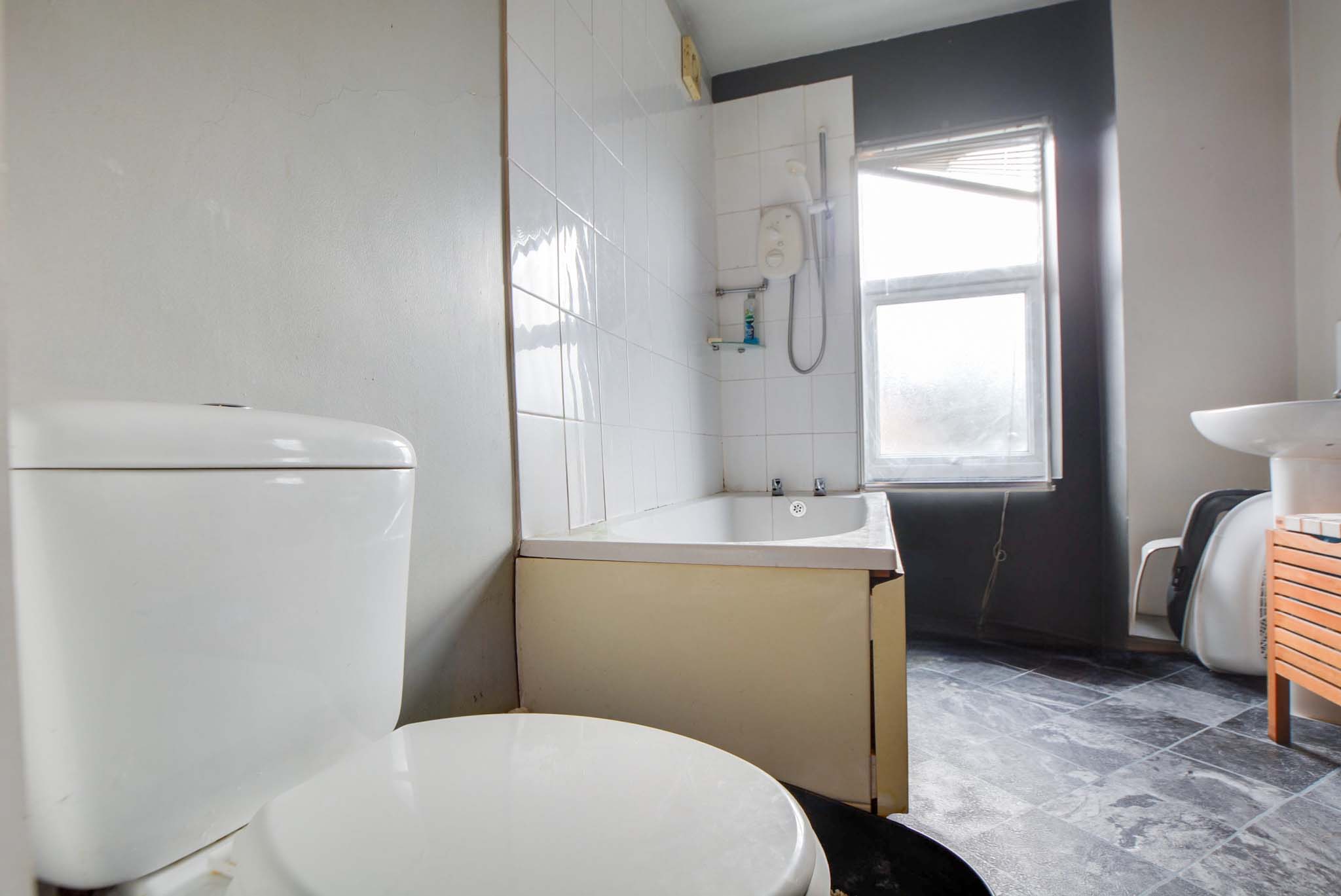 With double glazed window to the rear elevation, bath with shower over and shower screen, low-level WC, wash hand basin, part tiled walls.