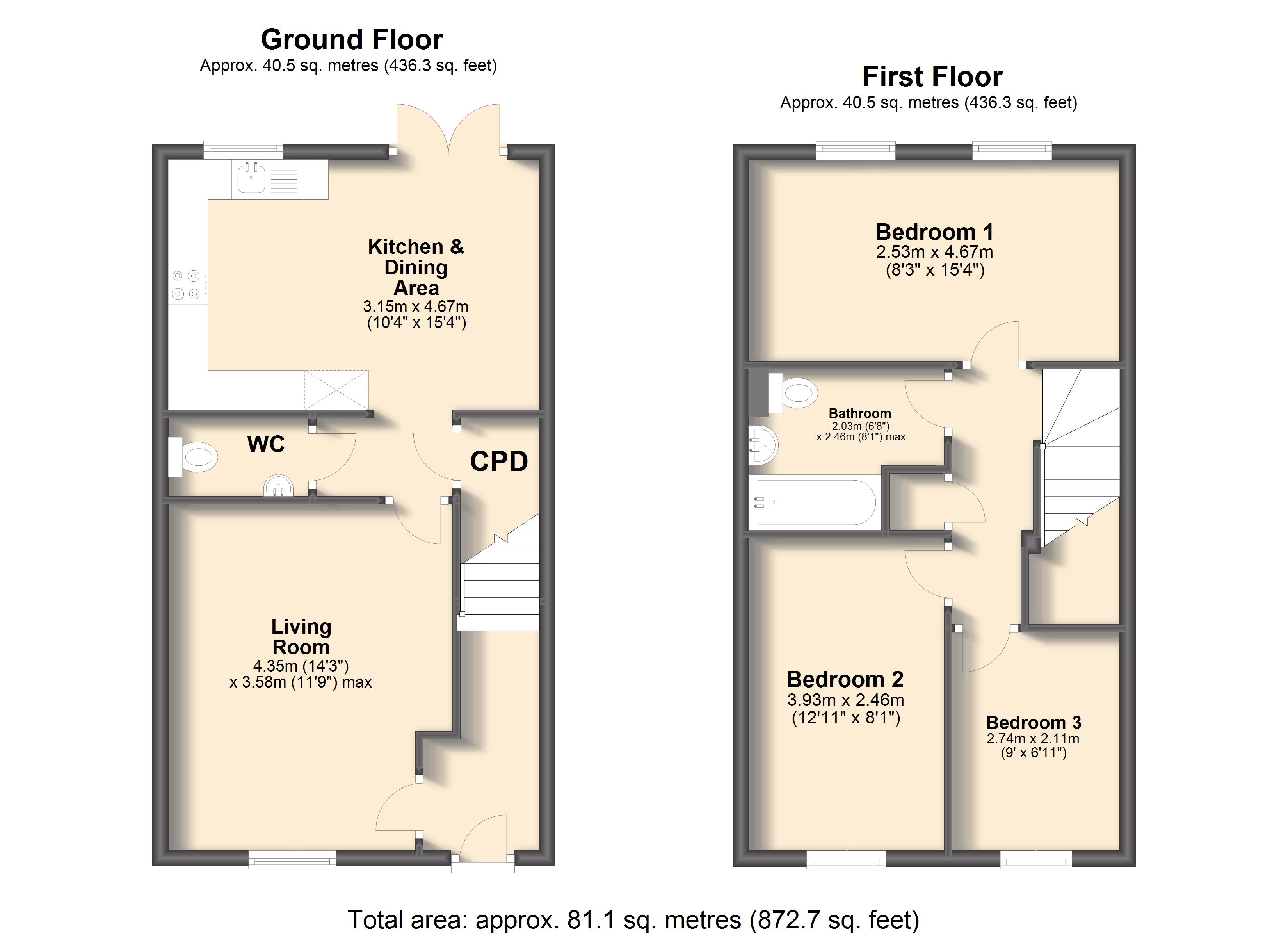 Upstairs, the property offers three well-appointed bedrooms. Each room provides plenty of space for both freestanding and fitted furniture, allowing flexibility for a variety of uses, including home working or family living. These rooms are served by a family bathroom fitted with a contemporary three-piece suite.