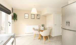 The ground floor includes a spacious open-plan kitchen and dining area, providing a practical layout for everyday living and entertaining. The kitchen is fitted with contemporary units and offers ample worktop space, while the dining area benefits from doors opening directly onto the rear garden.