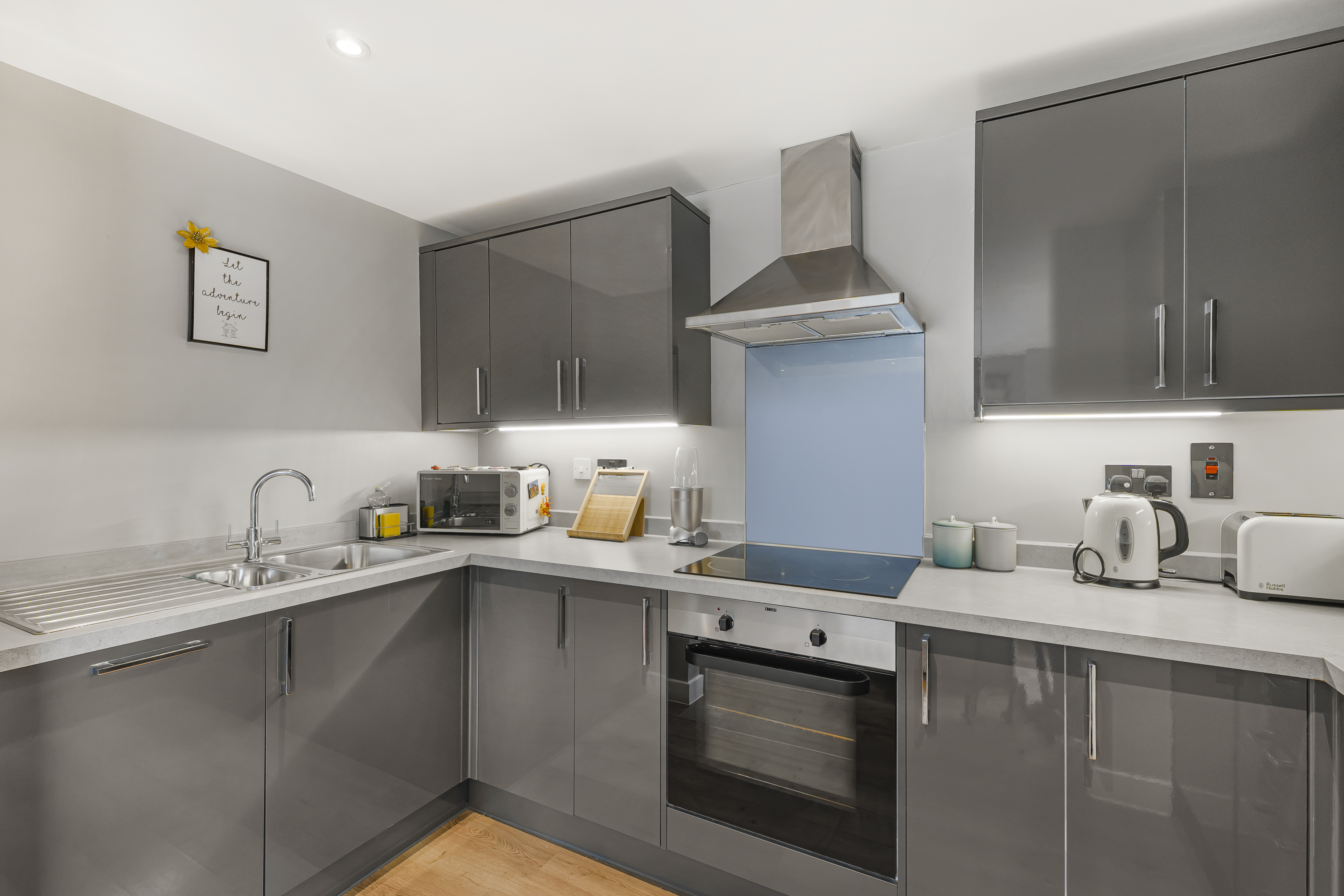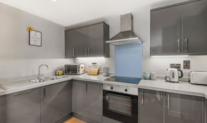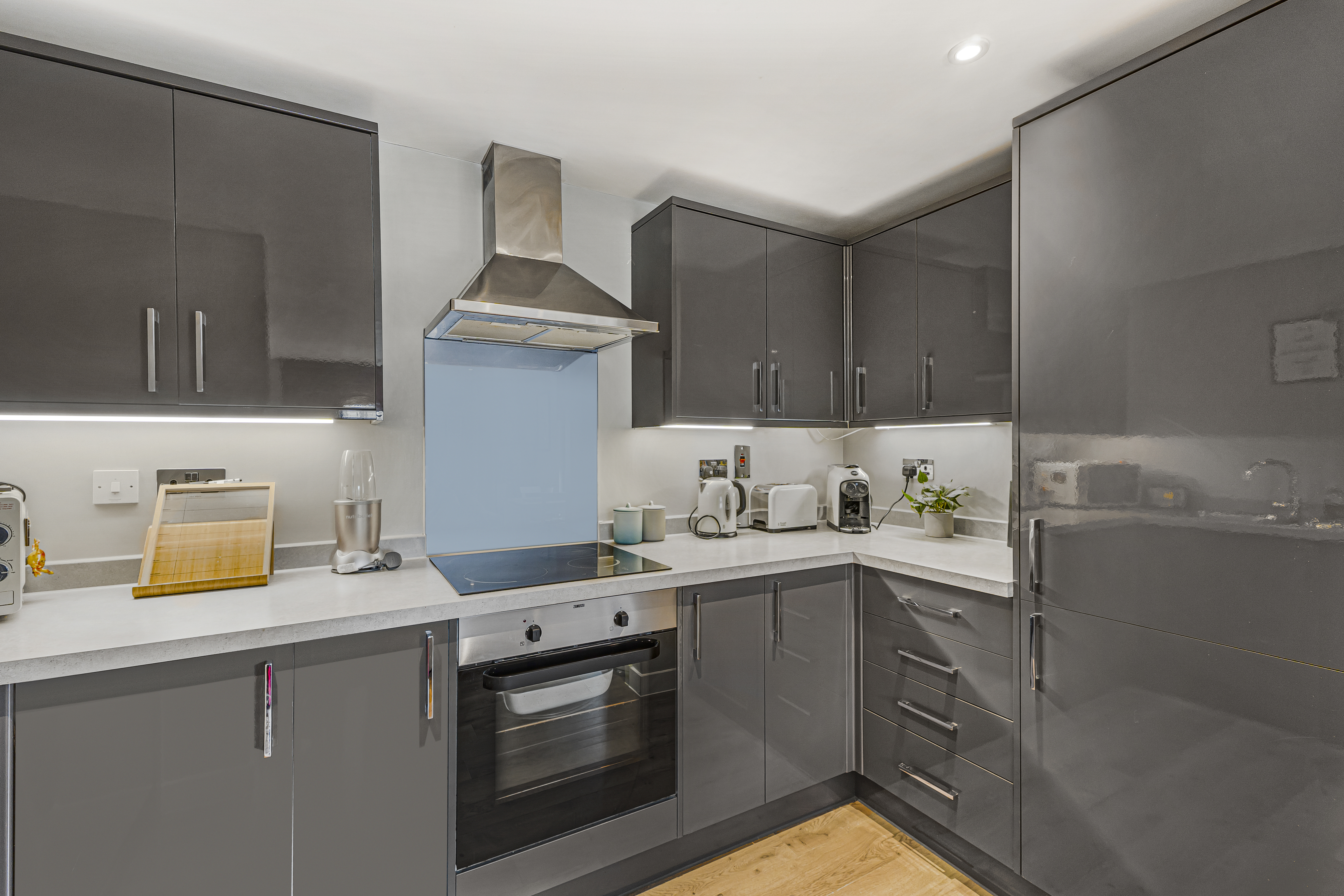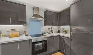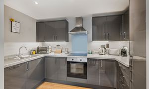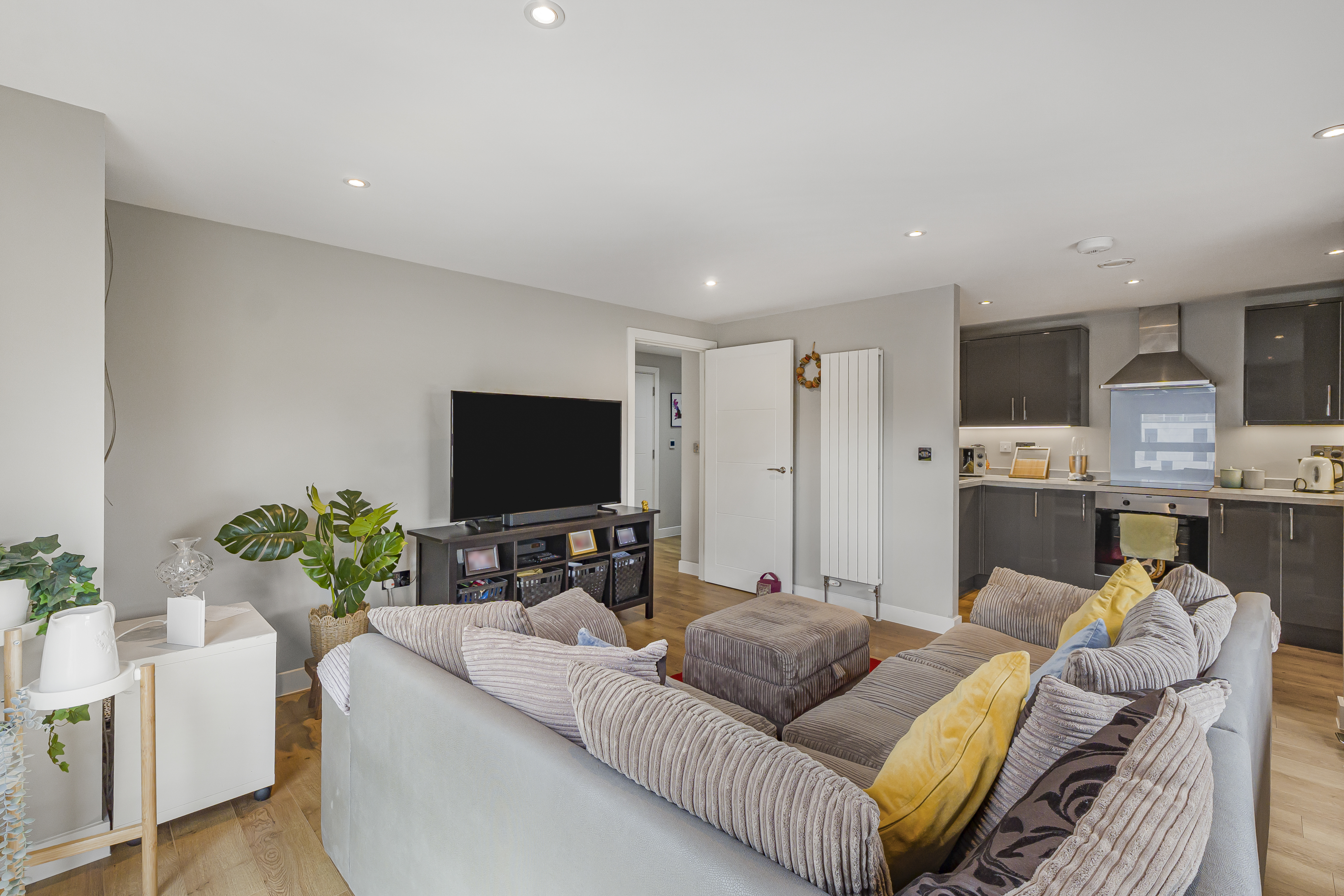 The main living space is a bright double-aspect open-plan kitchen/reception room, creating a particularly light and airy environment with ample space to relax and dine. The modern kitchen is fitted with integrated appliances and a good range of storage and worktop space.