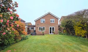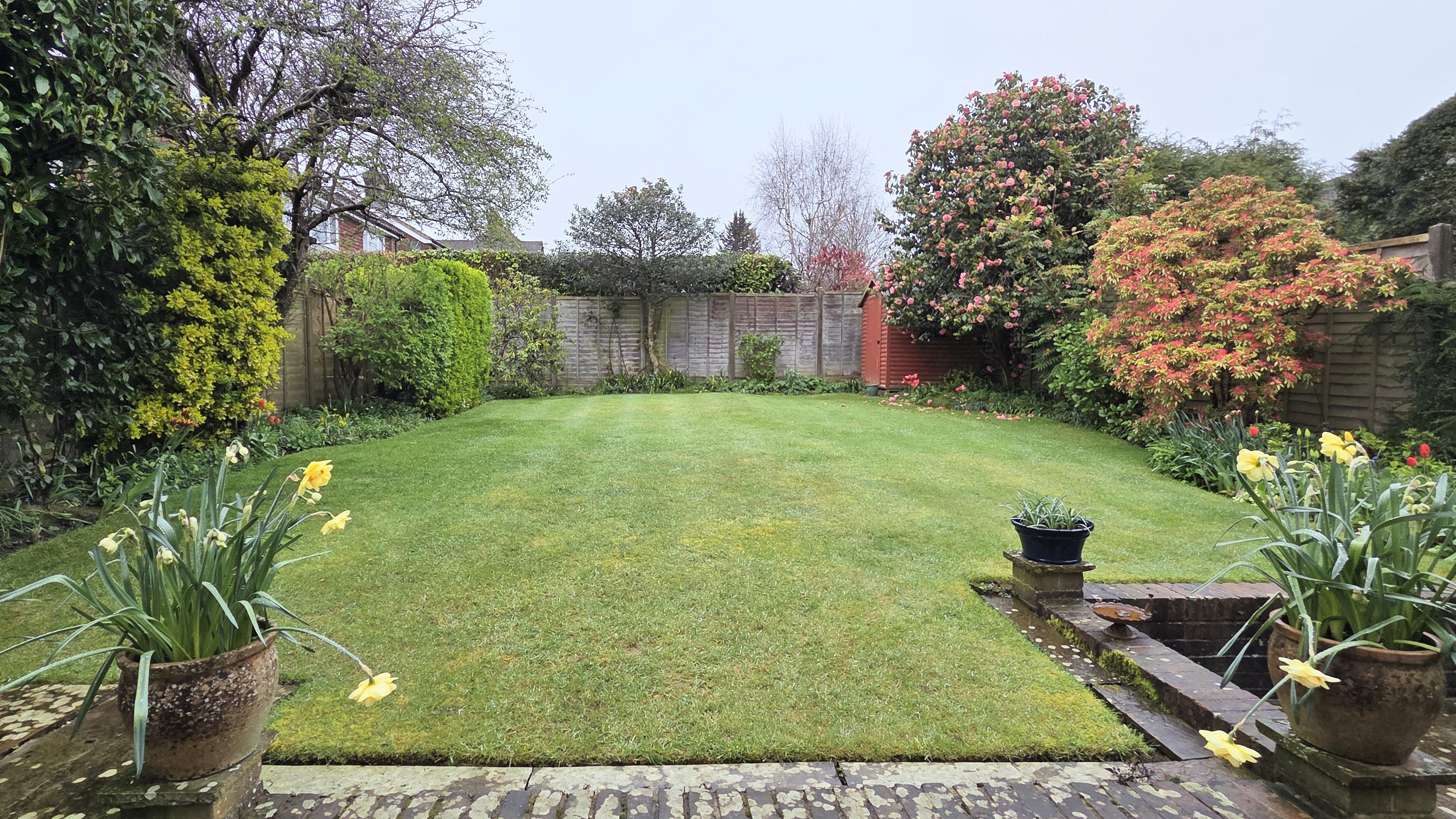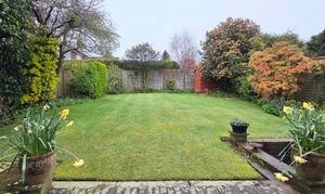 Frontage: 37' deep x 36' wide laid to Private Driveway and shaped lawns. Side access around to the mature 52' x 37' Rear Garden laid to full width patio, lawns and colourful plants, flowers and shrubs.