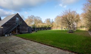 - Large flat garden with lawn, patio and play area, plus meadow; driveway, EV charger and double garage with useful room above.