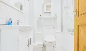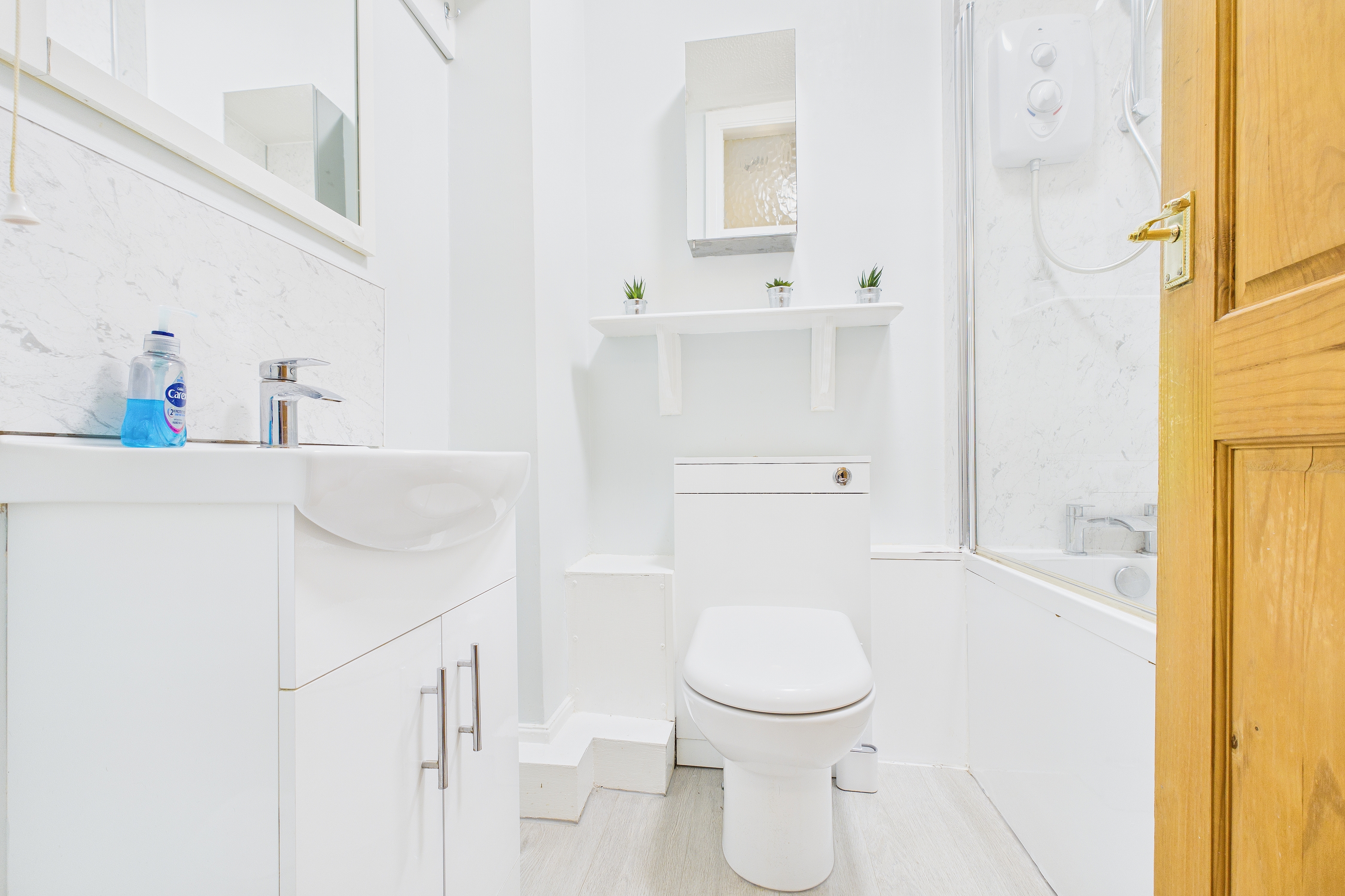 A staircase with glazed inserts rises from the living area to the first floor landing, where there is access to the fully boarded storage space in the attic via the loft hatch to ceiling above. The landing provides access to two bedrooms and the bathroom. The bathroom is fitted with a three-piece white suite and serves both bedrooms.