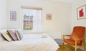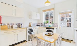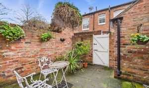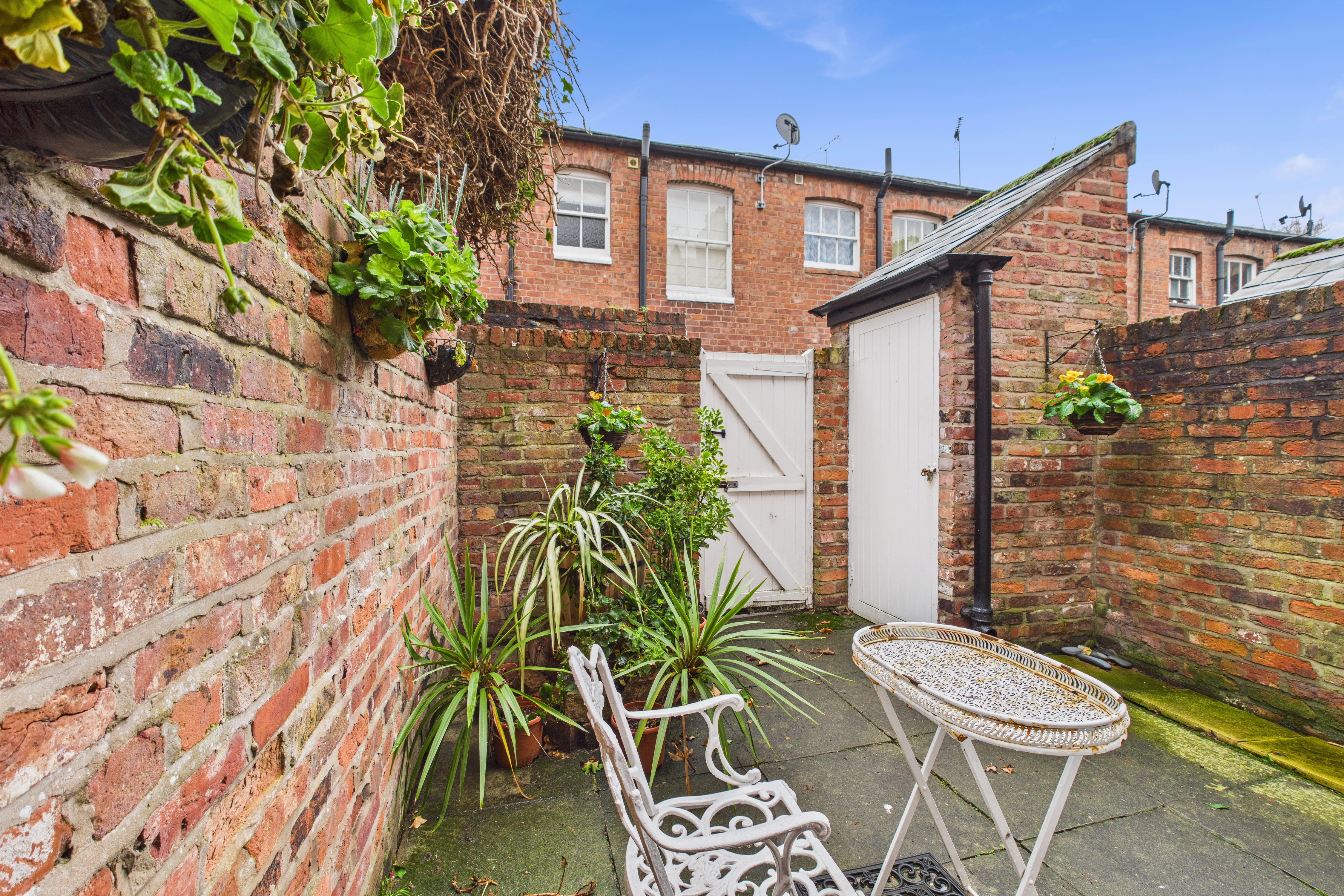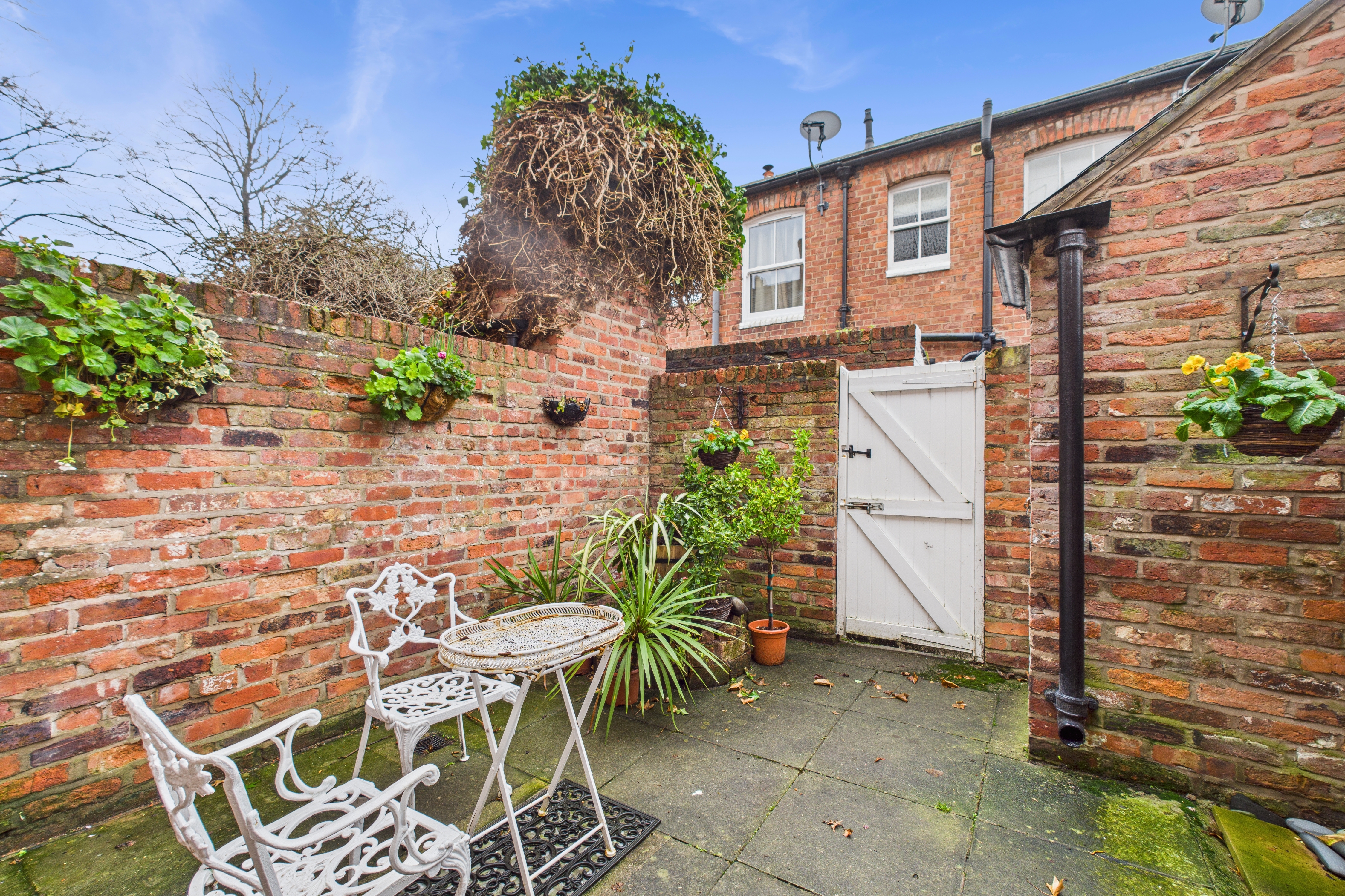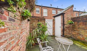 A charming south-facing walled courtyard garden, laid with paving and offering a private outdoor retreat. Additional benefits include a brick-built storage unit and gated access to a communal rear alley.