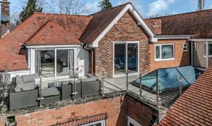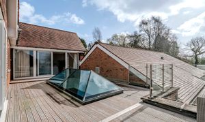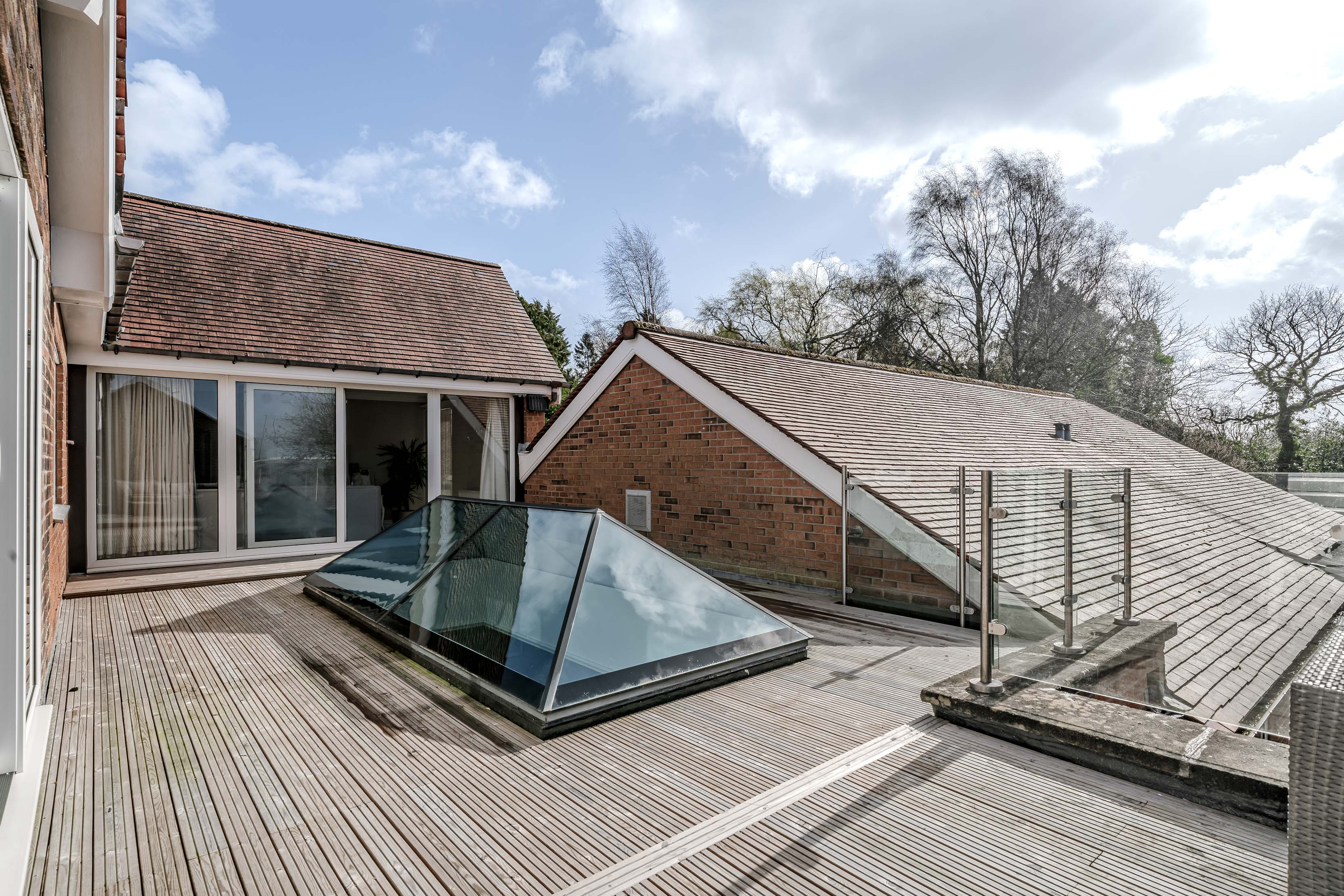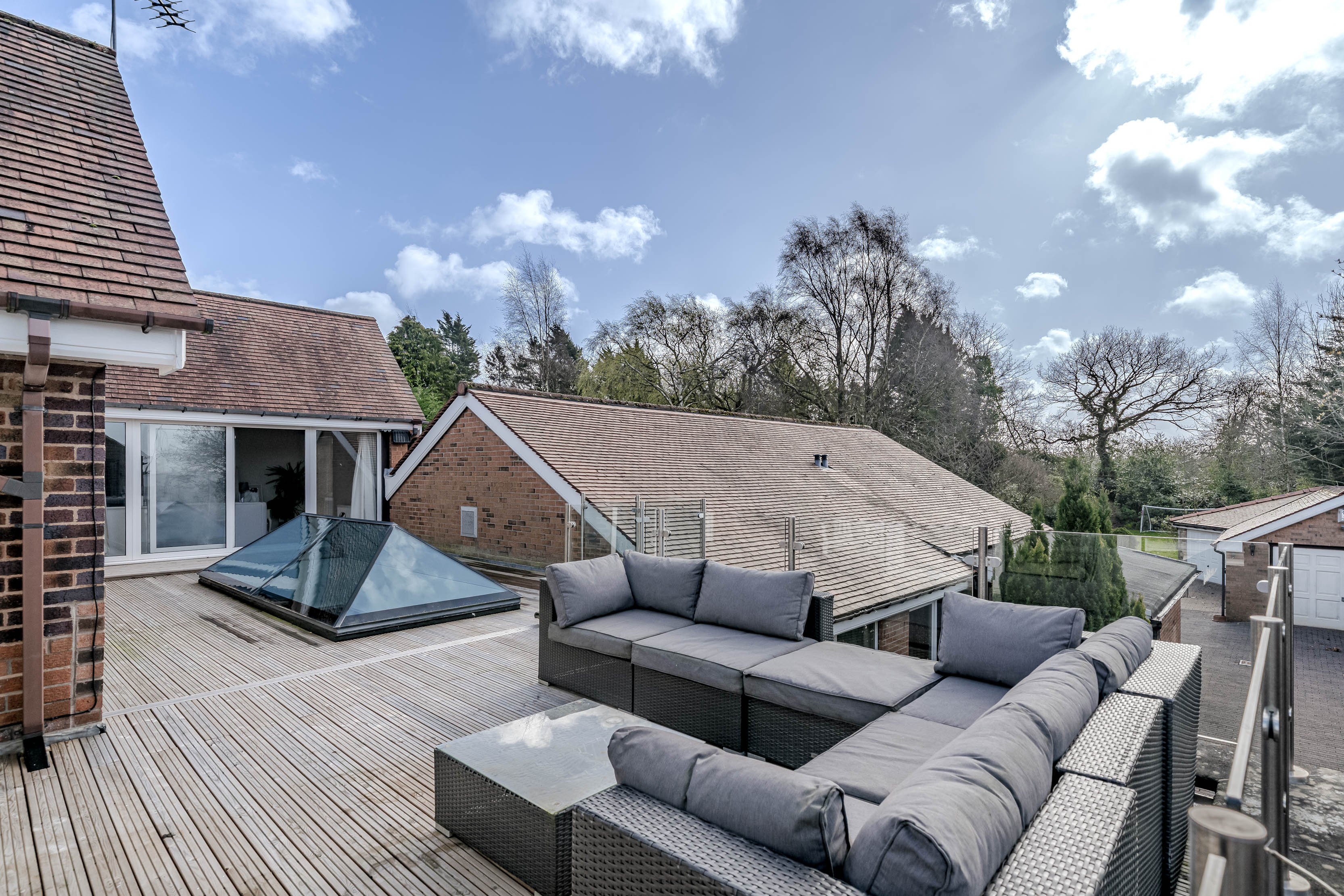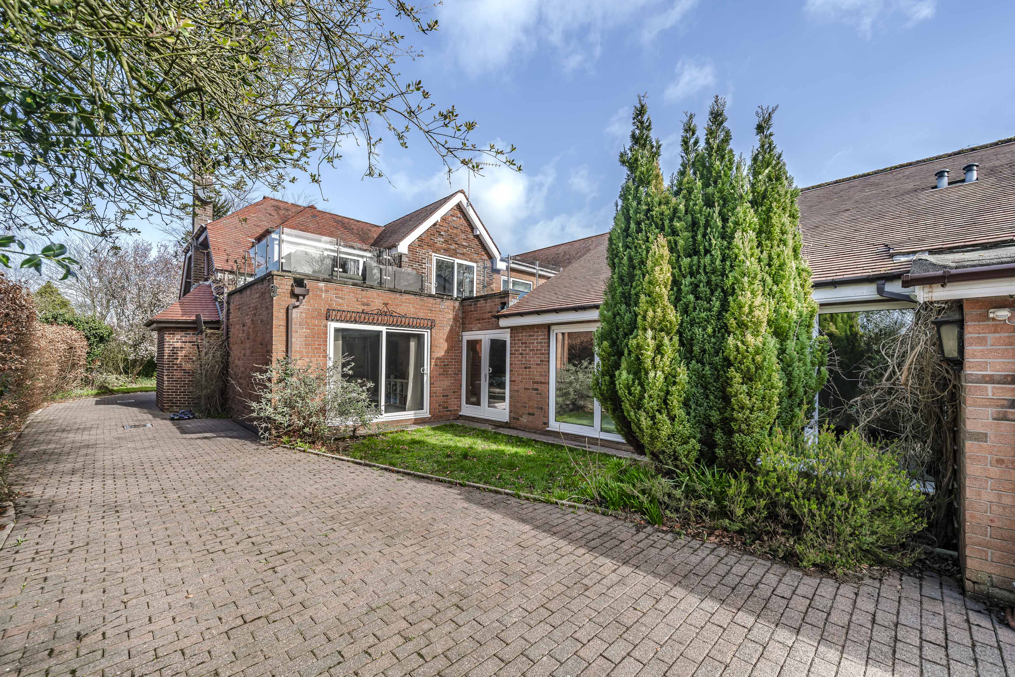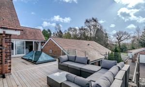 Externally, the grounds provide privacy and excellent outdoor amenity. The block paved driveway provides ample parking for multiple cars, and provides access to the detached garage block located at the rear; which could form an annexe to the main house (subject to planning department discussion). Front and rear (South Facing) garden areas are laid to lawn with a wealth of surrounding mature trees and planting. At first floor, the roof terrace (orientated for morning, midday and afternoon sun) with glazed balustrade, offers an ideal setting for outdoor seating and entertaining, enjoying an attractive elevated aspect across the surrounding grounds.