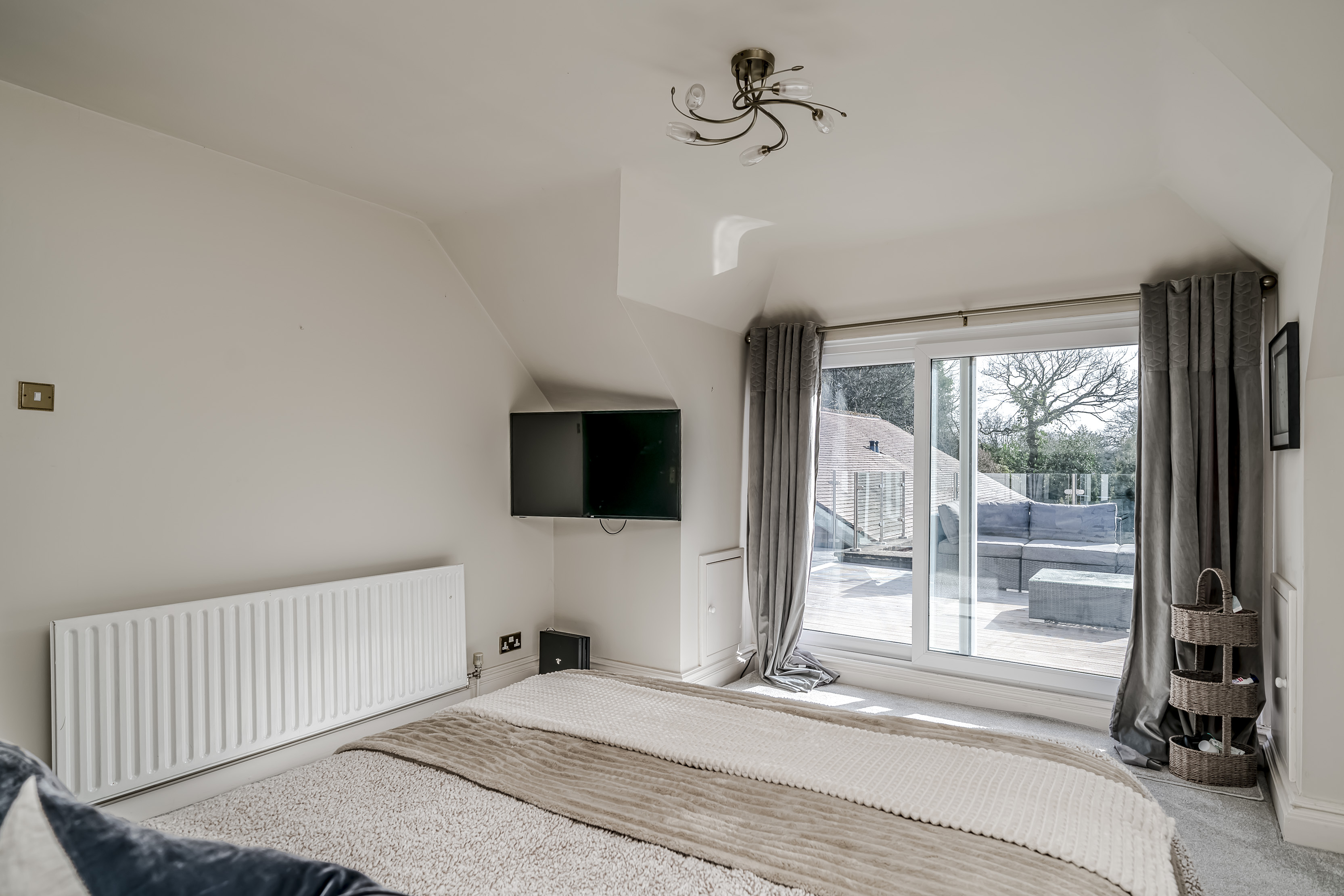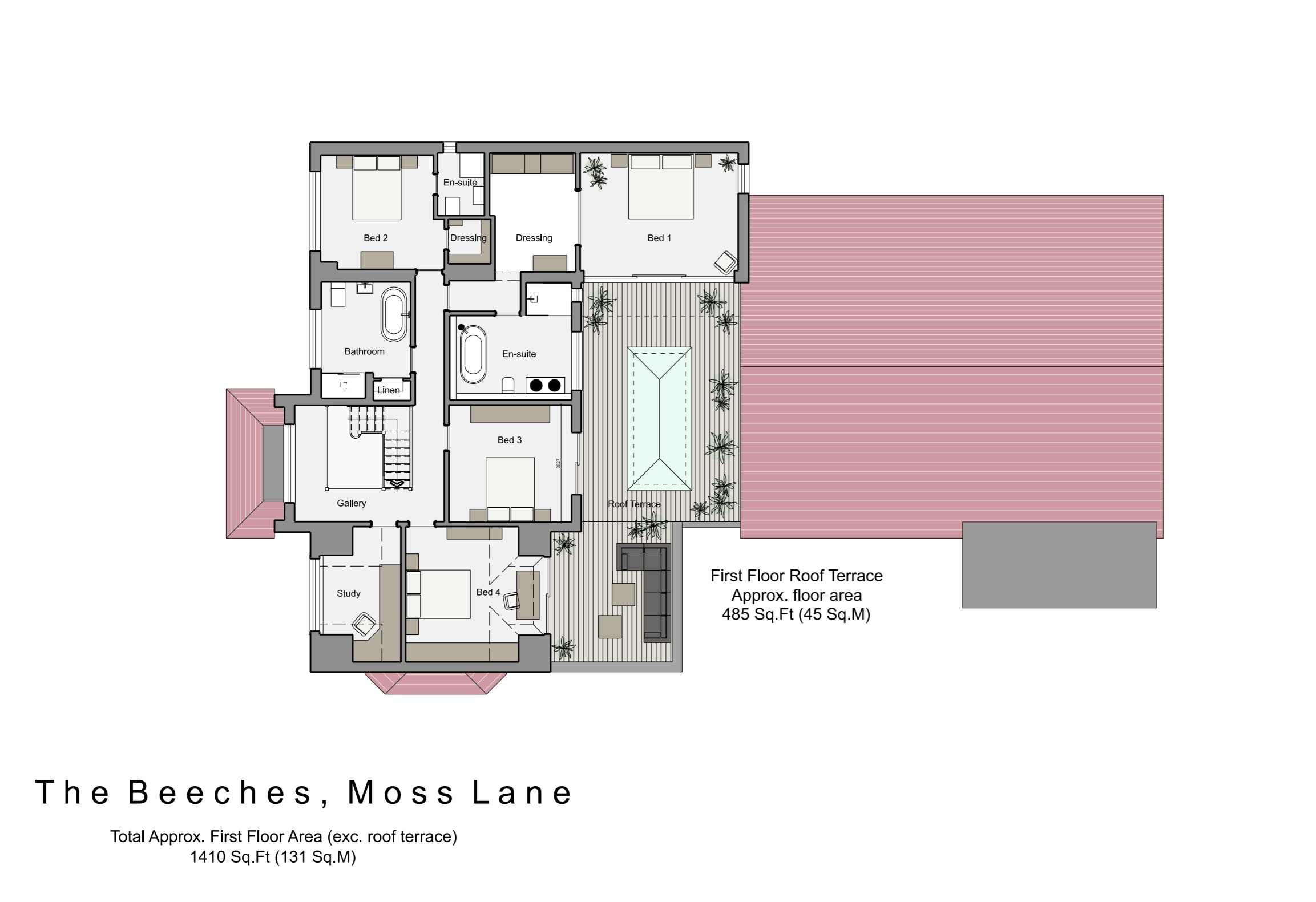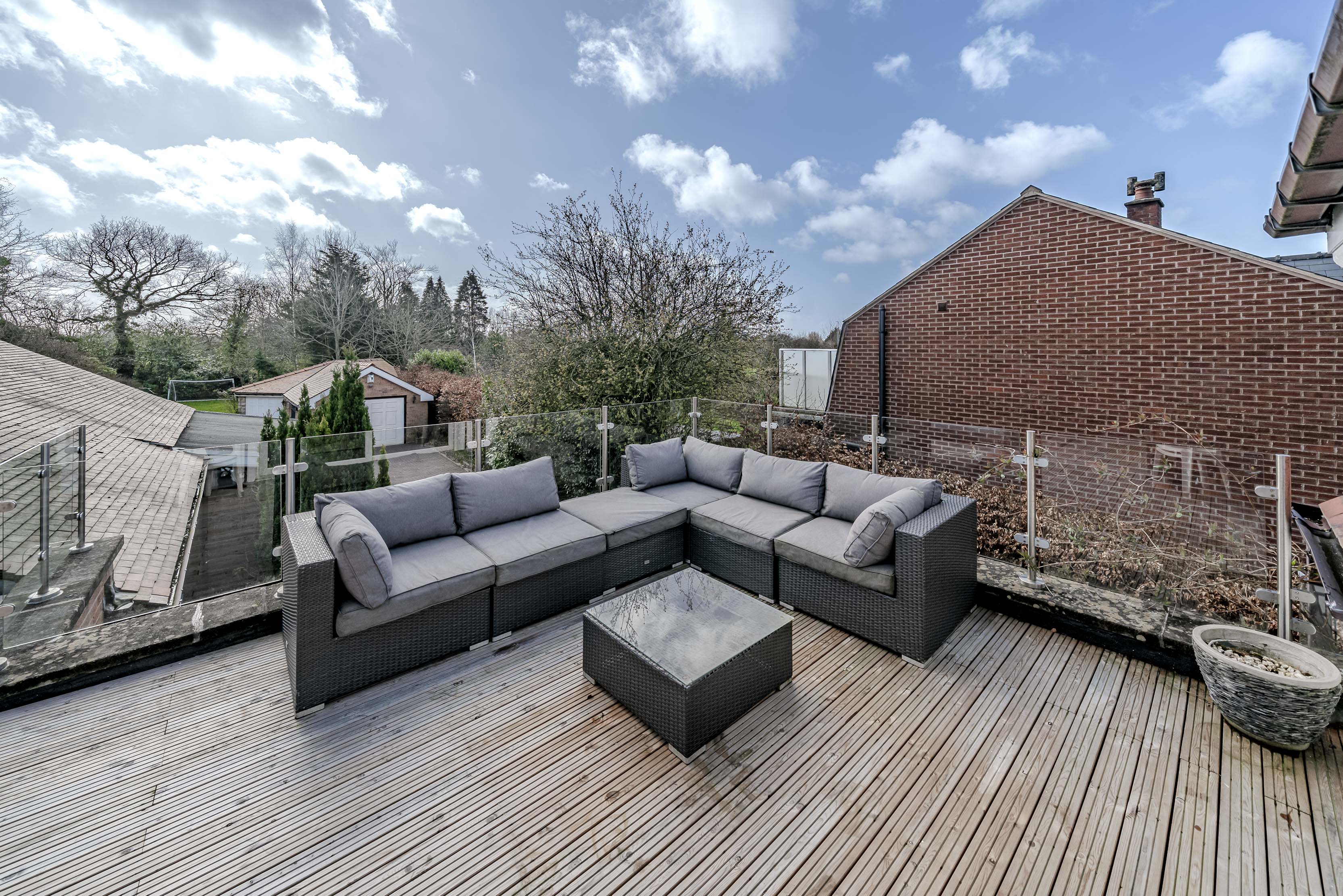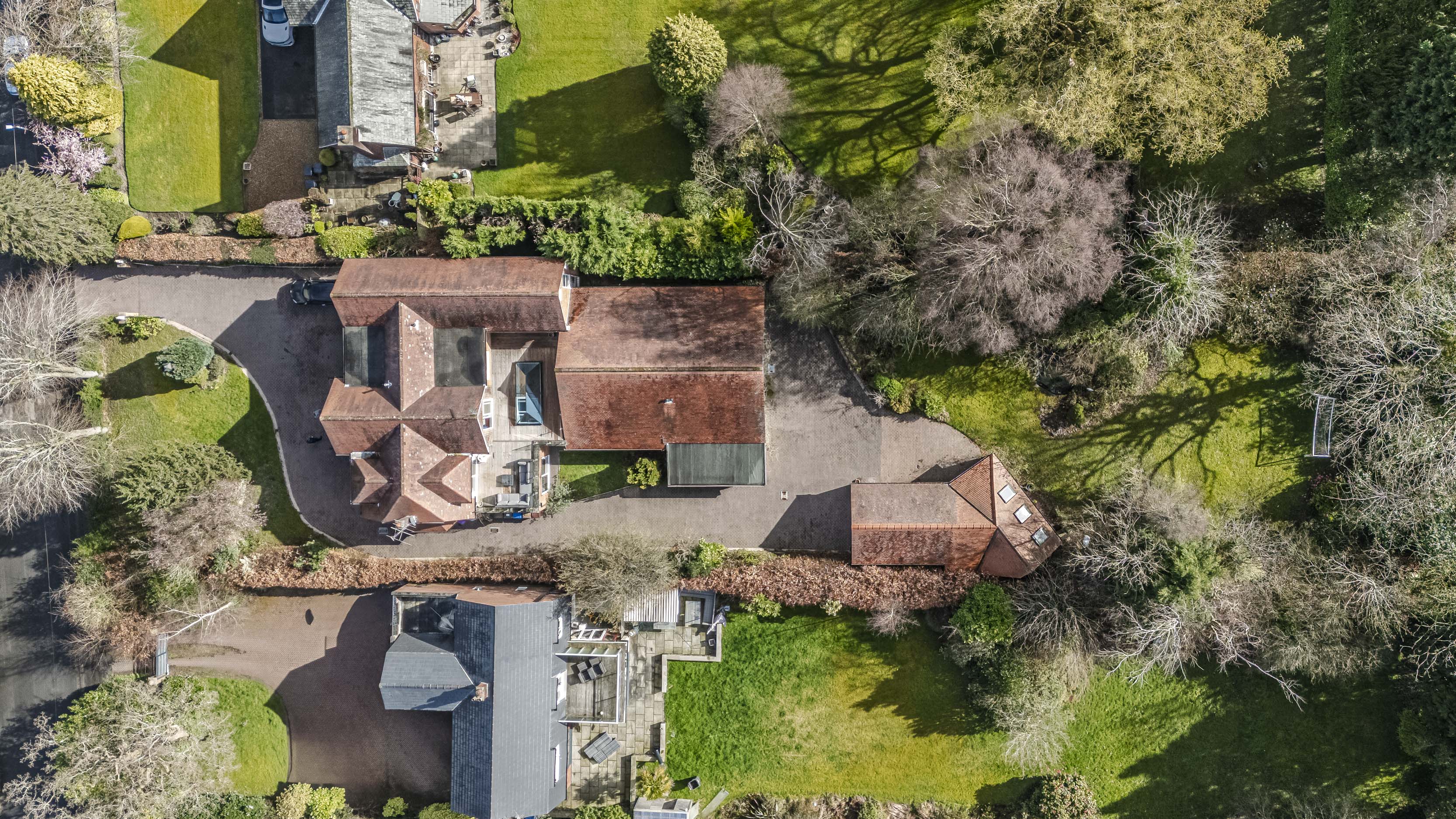 Externally, the grounds provide privacy and excellent outdoor amenity. The block paved driveway provides ample parking for multiple cars, and provides access to the detached garage block located at the rear; which could form an annexe to the main house (subject to planning department discussion). Front and rear (South Facing) garden areas are laid to lawn with a wealth of surrounding mature trees and planting. At first floor, the roof terrace (orientated for morning, midday and afternoon sun) with glazed balustrade, offers an ideal setting for outdoor seating and entertaining, enjoying an attractive elevated aspect across the surrounding grounds.