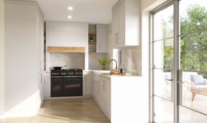 • Fully fitted painted Shaker-style kitchen with quartz worktop and full height backsplash