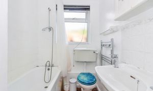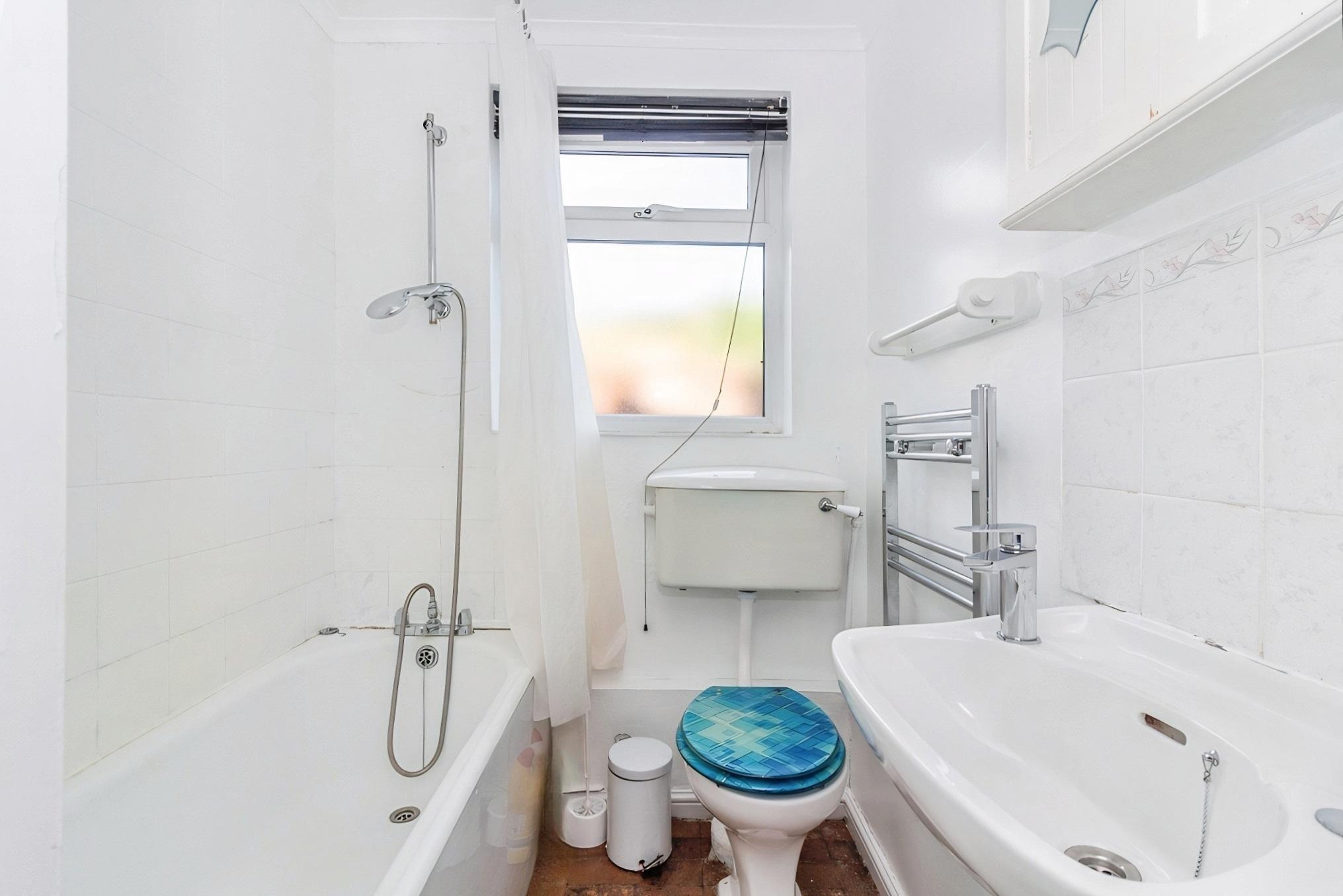 Located at the rear of the property, the bathroom includes a white three-piece suite comprising a panelled bath with overhead shower attachment, pedestal wash basin and WC. A frosted rear-facing window allows for natural light and ventilation, and there is also a heated towel rail and wall-mounted storage cabinet. The layout is practical and well arranged for everyday use.