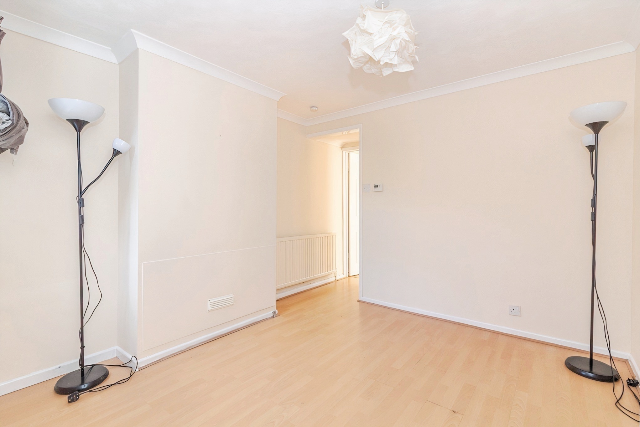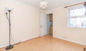 The property opens into a bright and well-proportioned living room, offering a practical space that works well as the main day-to-day area. A large front-facing window brings in good natural light, while the neutral walls and wood-effect flooring provide a simple backdrop that new owners can personalise. There is a useful understairs area leading to the first-floor staircase, and the room flows naturally through to the dining room, giving the ground floor an open and connected feel.