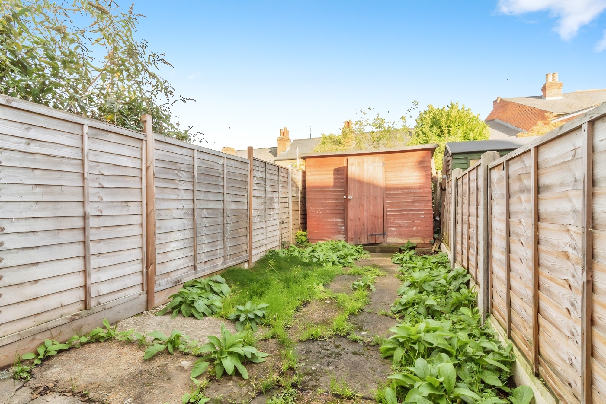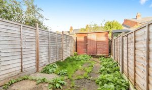 - Private rear garden with timber fencing and storage shed.