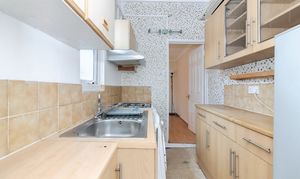 Located to the rear of the property, the kitchen is arranged in a practical galley layout with worktops and storage options on both sides. There is space and plumbing for appliances, along with a gas cooker and stainless steel sink beneath a side-facing window that brings in natural light. The layout connects directly to the dining room and provides access to the rear lobby and bathroom, making it a functional hub for the home.