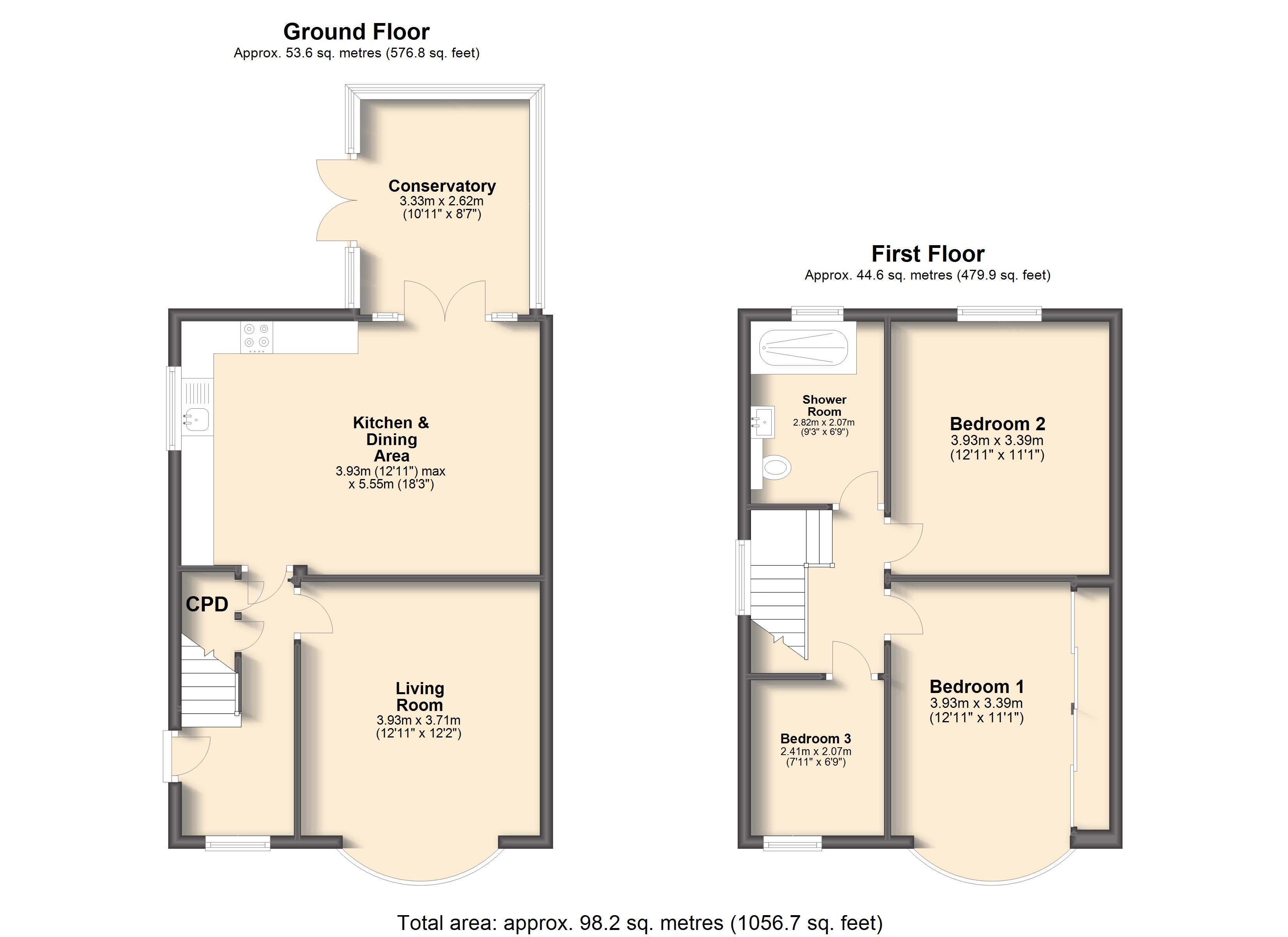 Upstairs, the home offers three excellent-sized bedrooms, comprising two well-proportioned doubles and a versatile single room. A contemporary shower room, finished with a modern three-piece suite, completes the first floor.