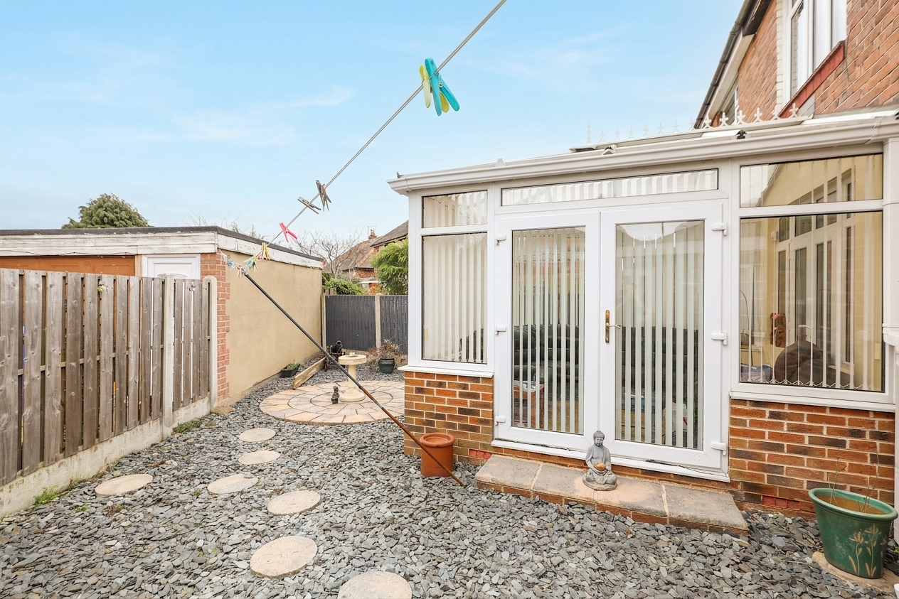 The rear garden has been designed for low maintenance, featuring a gravelled seating area that pairs perfectly with the conservatory for entertaining. To the front, an enclosed lawn bordered by mature trees provides a safe and attractive space for children to play.