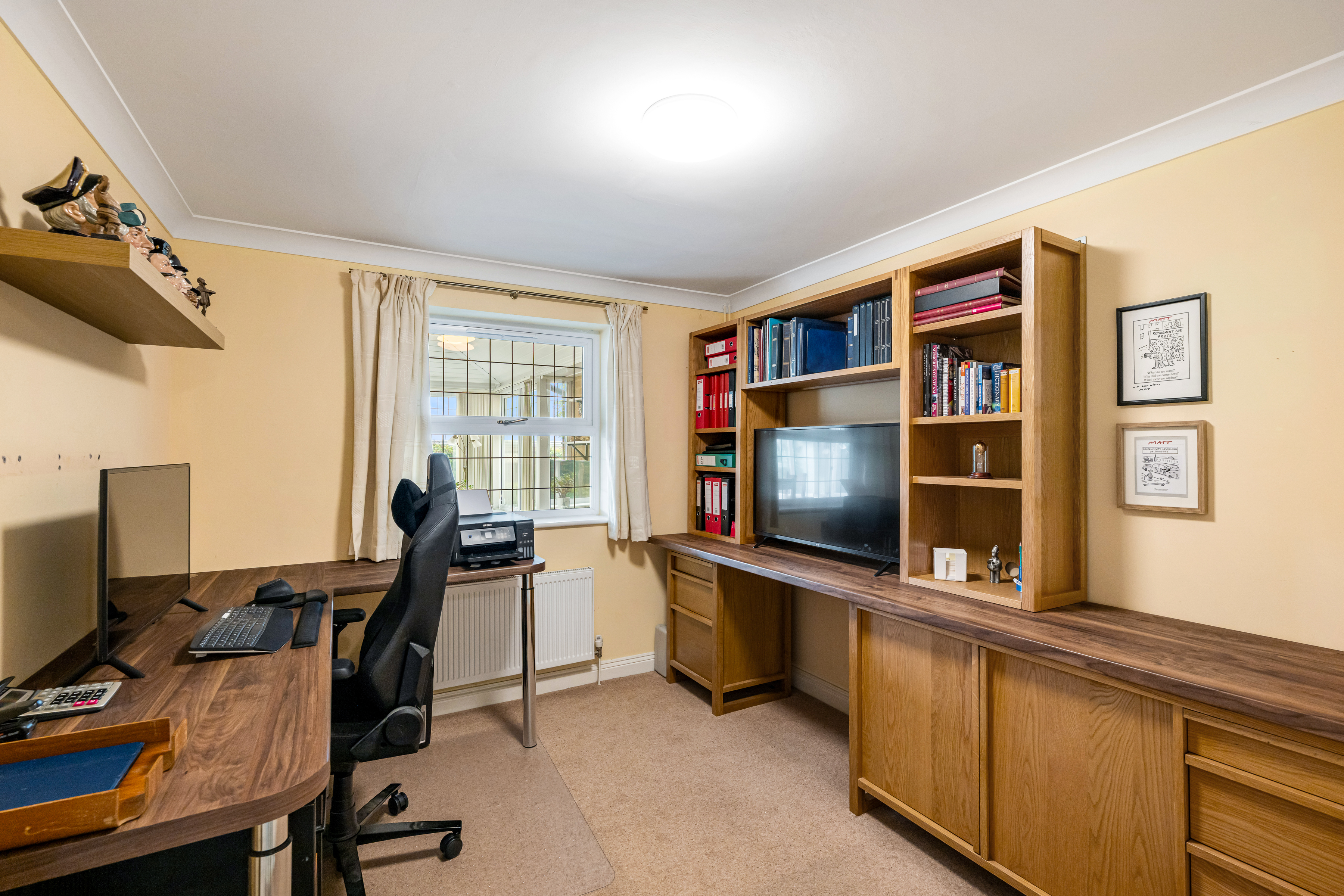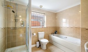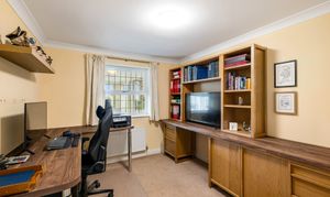 The ground floor also boasts a spacious living room, the family bathroom, and three well-proportioned bedrooms—two with fitted wardrobes, with bedroom two benefitting from its own ensuite shower room. Bedroom four is also on the ground floor, along with a study at the front of the property. To access the first floor, you walk through the study and up the staircase.